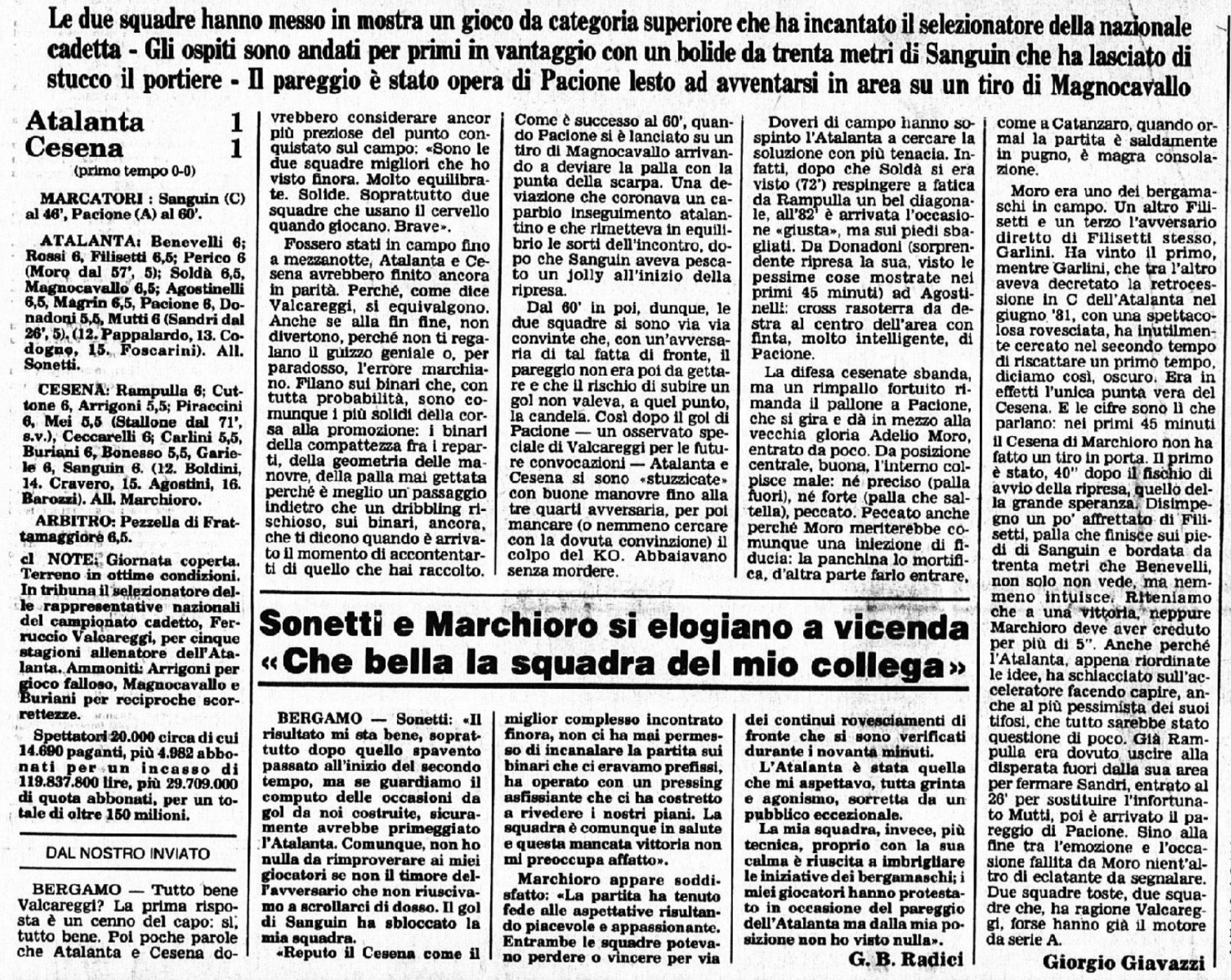 Fonte: “Cesena Calcio, una storia unica“, Geo Edizioni biglietto Copertina de L'Uovo del 3 ottobre 1983 con il resoconto della partita L'articolo della Gazzetta dello Sport L'articolo della Gazzetta dello Sport CESENA-MONZA 1983-84 CESENA-PERUGIA 1983-84