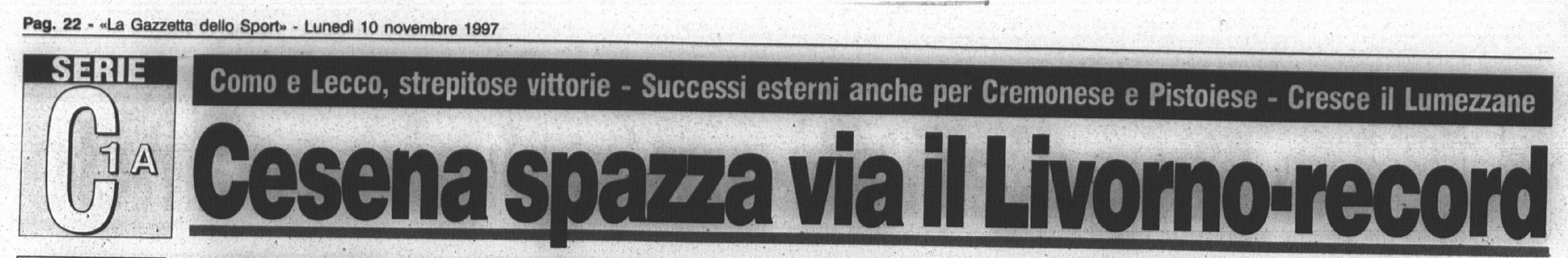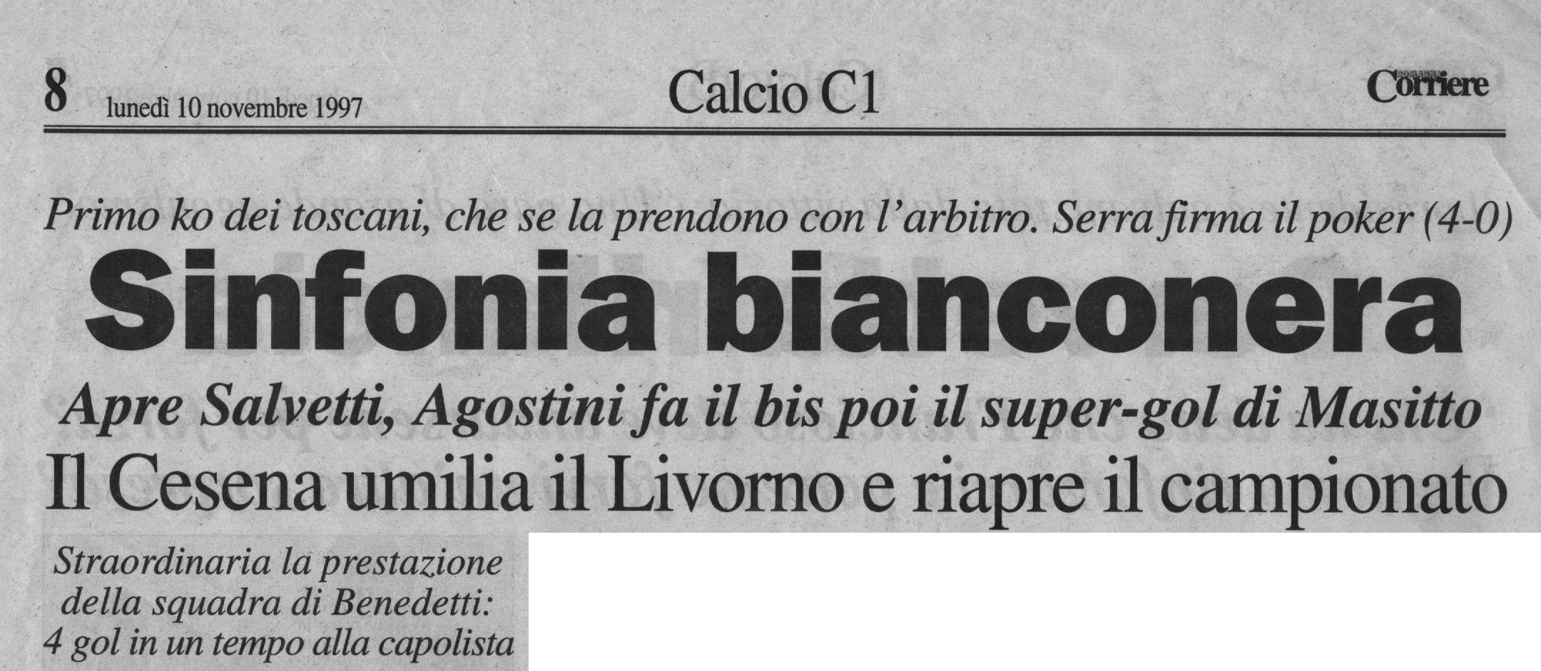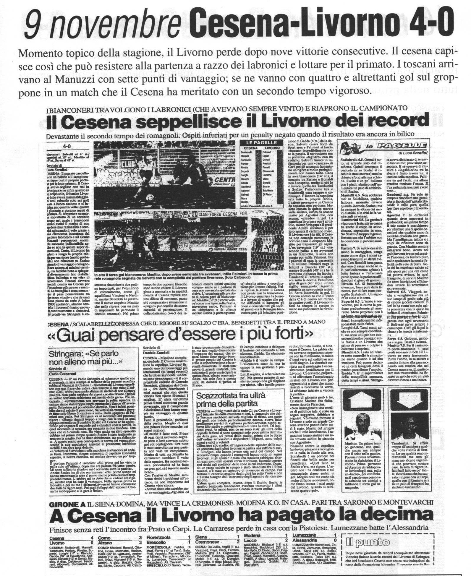 Per Masitto è il debutto con la maglia bianconera Fonte: "Cesena Calcio, una storia unica", Geo Edizioni La maglia indossata da Mantelli L'appello lanciato a mezzo volantino da Giulio Benedetti, presidente del Centro Coordinamento Clubs Cesena Corriere Romagna La punizione vincente di Salvetti apre la goleada (foto Salvi - Corriere Romagna) La Gazzetta dello Sport Il Resto del Carlino (fascicolo Speciale Promozione) Titolo a tutta pagina di Stadio Il tecnico livornese non ci sta... (da Stadio) VEDI ANCHE Io, i livornesi e Stringara LECCO-CESENA 1997-98 PRATO-CESENA 1997-98