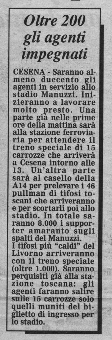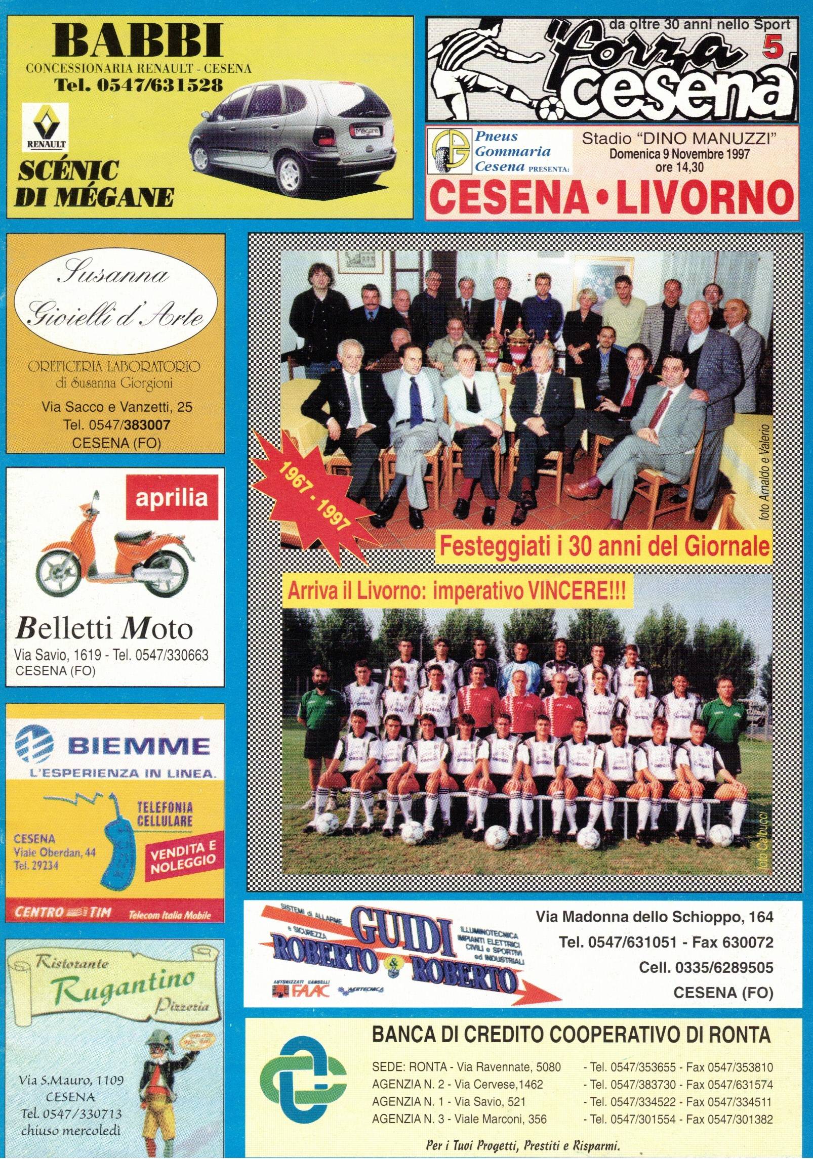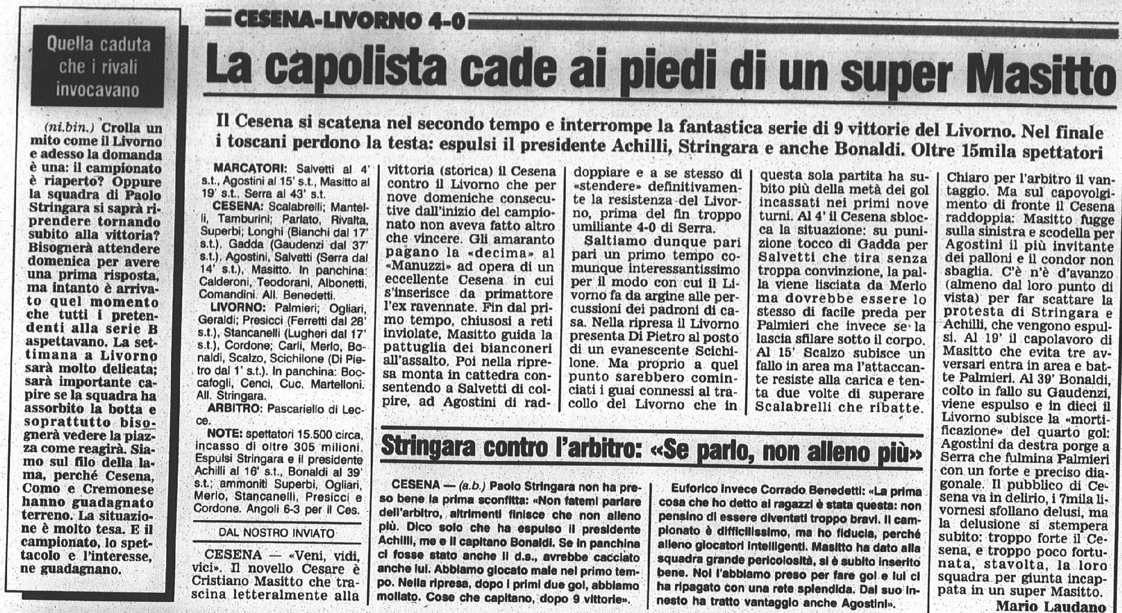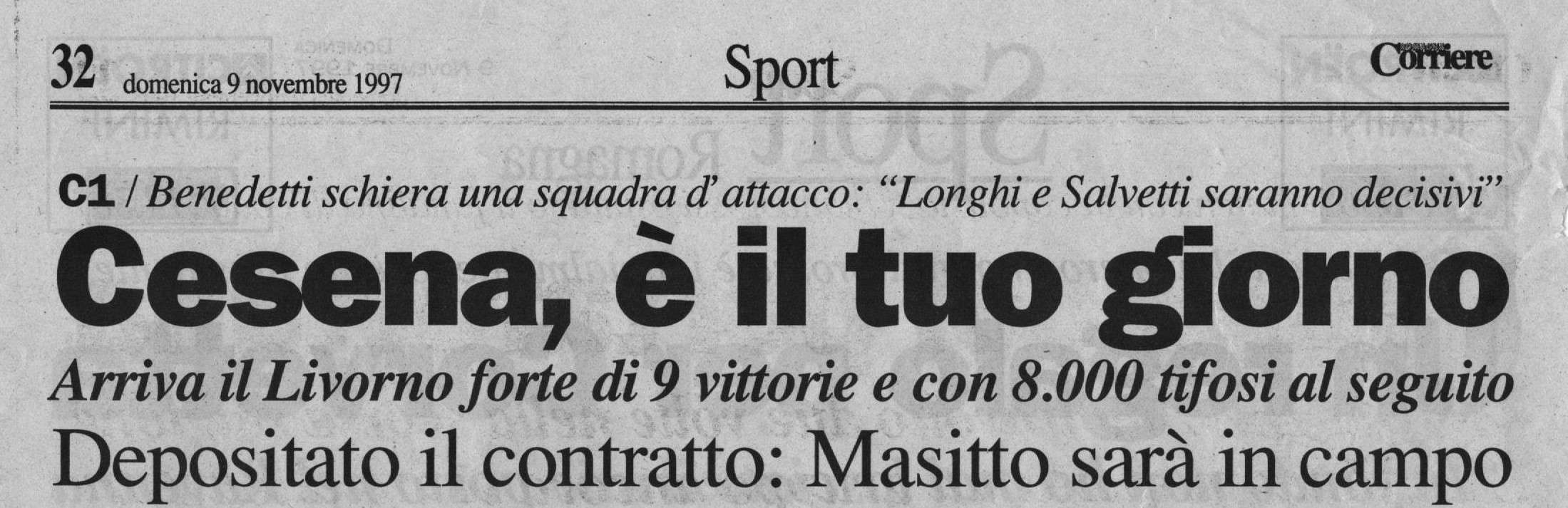 Per Masitto è il debutto con la maglia bianconera Fonte: "Cesena Calcio, una storia unica", Geo Edizioni La maglia indossata da Mantelli L'appello lanciato a mezzo volantino da Giulio Benedetti, presidente del Centro Coordinamento Clubs Cesena Corriere Romagna La punizione vincente di Salvetti apre la goleada (foto Salvi - Corriere Romagna) La Gazzetta dello Sport Il Resto del Carlino (fascicolo Speciale Promozione) Titolo a tutta pagina di Stadio Il tecnico livornese non ci sta... (da Stadio) VEDI ANCHE Io, i livornesi e Stringara LECCO-CESENA 1997-98 PRATO-CESENA 1997-98