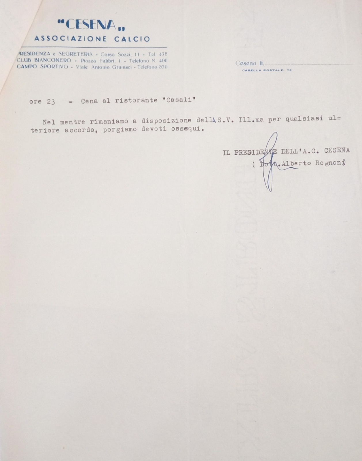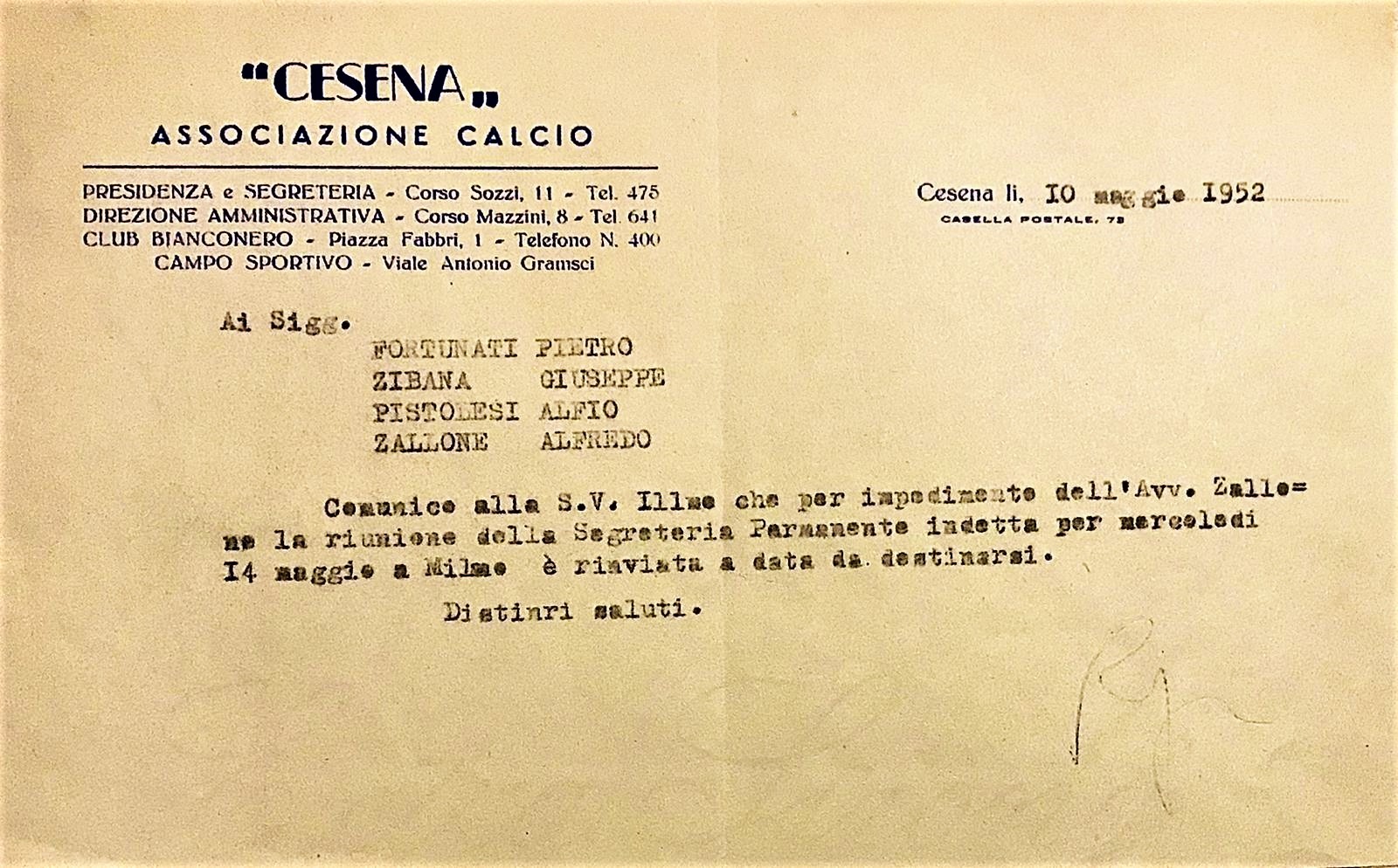 Carta intestata A.C. Cesena 1952-53 con firma Presidente Rognoni