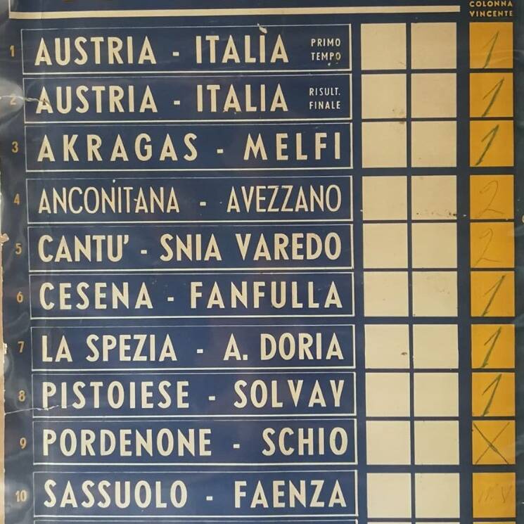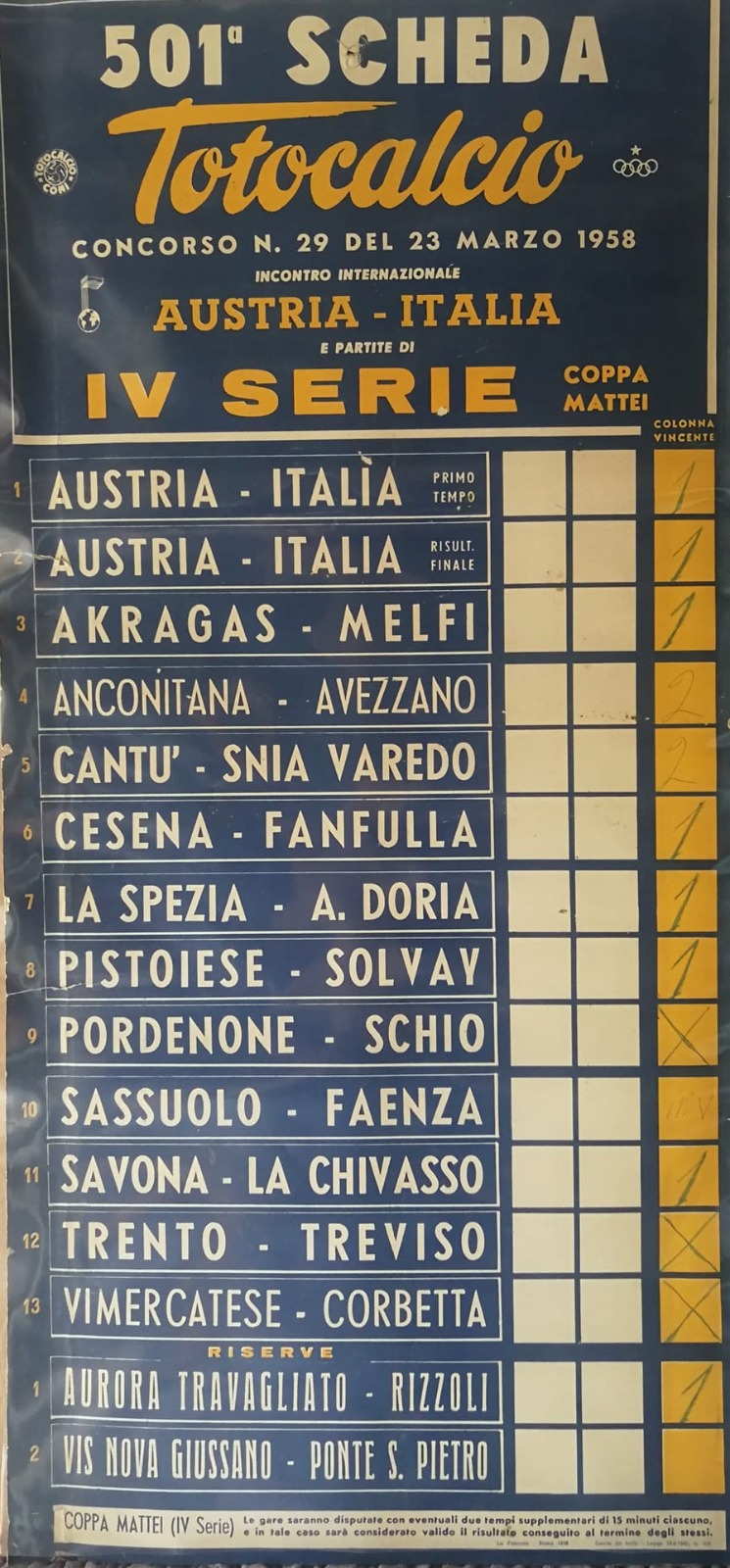 Schedina 23 marzo 1958 Coppa Ottorino Mattei Cesena-Fanfulla 1957-58