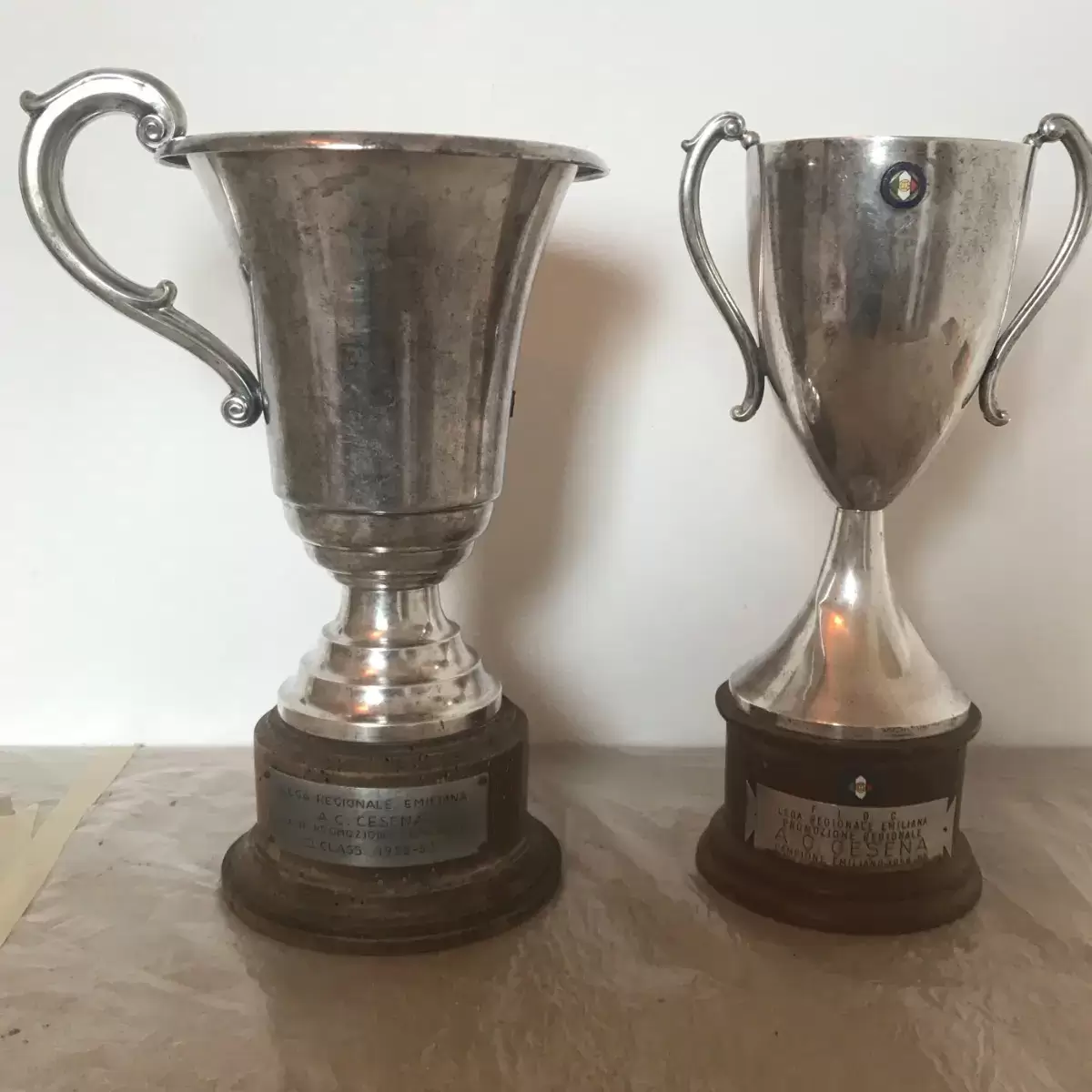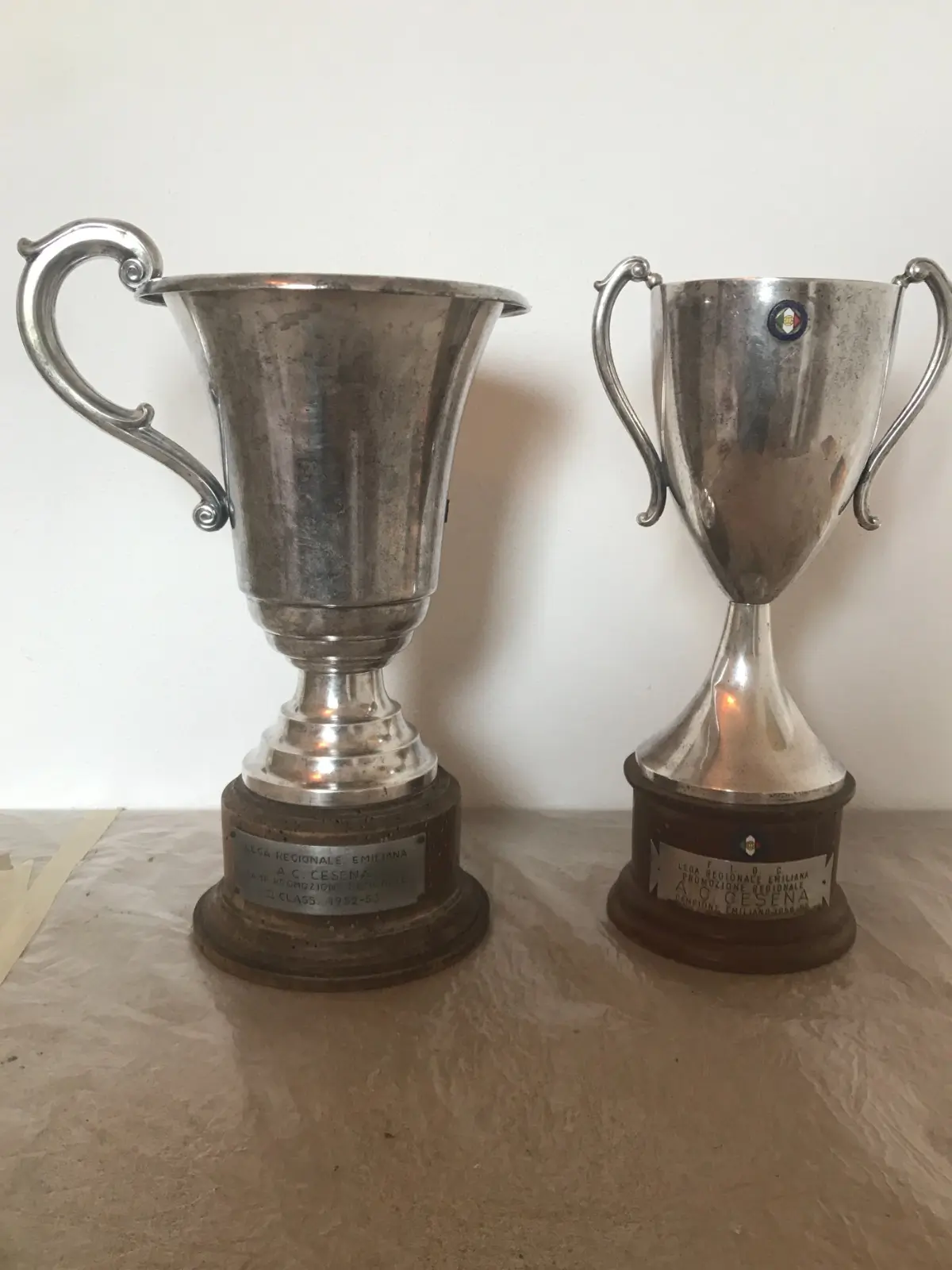 Coppe assegnate al Cesena dalla Lega Regionale Emiliana per il piazzamento al secondo posto nel 1952-53 (a sinistra) e per il titolo di campione regionale nel 1956-57 (a destra)