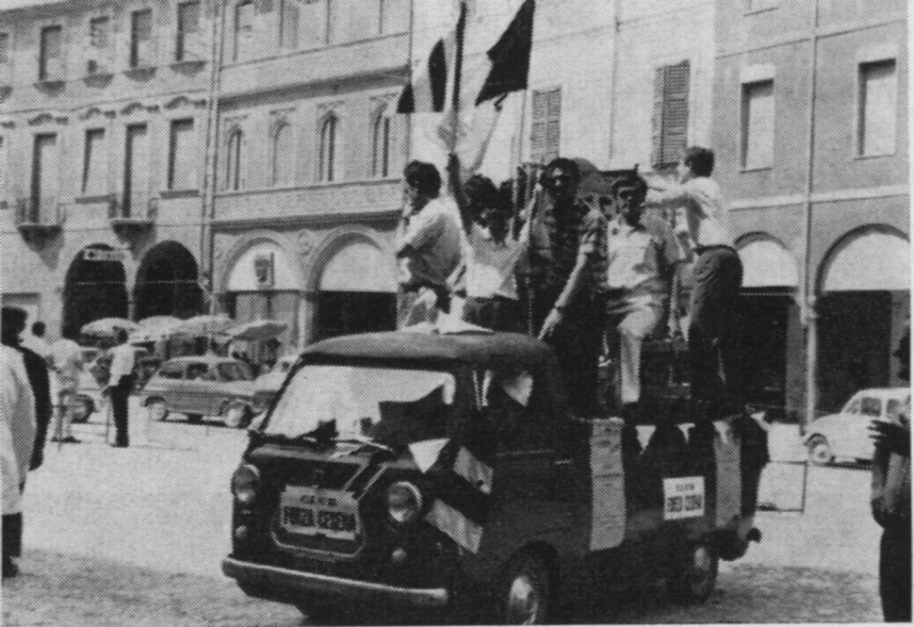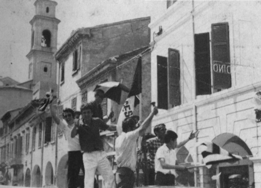 Cesena-Pontedera 1967-68. I tifosi da piazza del Popolo partono in corteo verso lo stadio per festeggiare la promozione in B