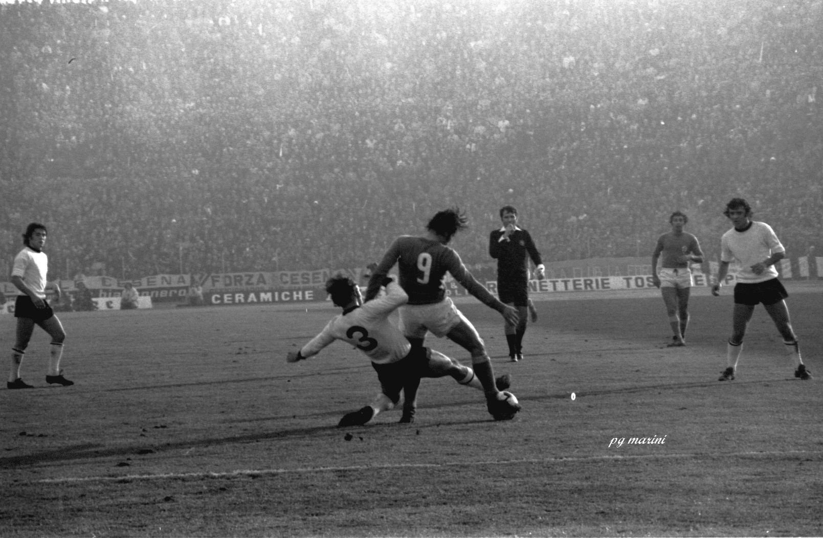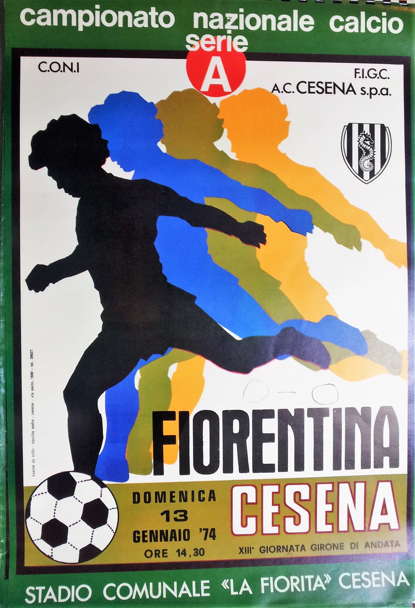 E la gara? Il primo tempo è ben giocato soprattutto dai bianconeri, con i viola disposti al contenimento e al contropiede. Della Fiorentina mi impressionano i difensori: i grandi e grossi Galdiolo e Della Martira, pure gli arcigni Roggi e Brizi. La ripresa è più equilibrata con molti attacchi anche della squadra toscana, ma l’azione più rilevante la crea il Cesena al 78’. Bertarelli colpisce violentemente il pallone di testa, molto angolato: mezzo stadio è pronta a gridare al gol, l’altra metà ha i brividi… ma uno strepitoso Superchi si supera con una memorabile parata in tuffo, negandoci la gioia del gol e la probabile vittoria.