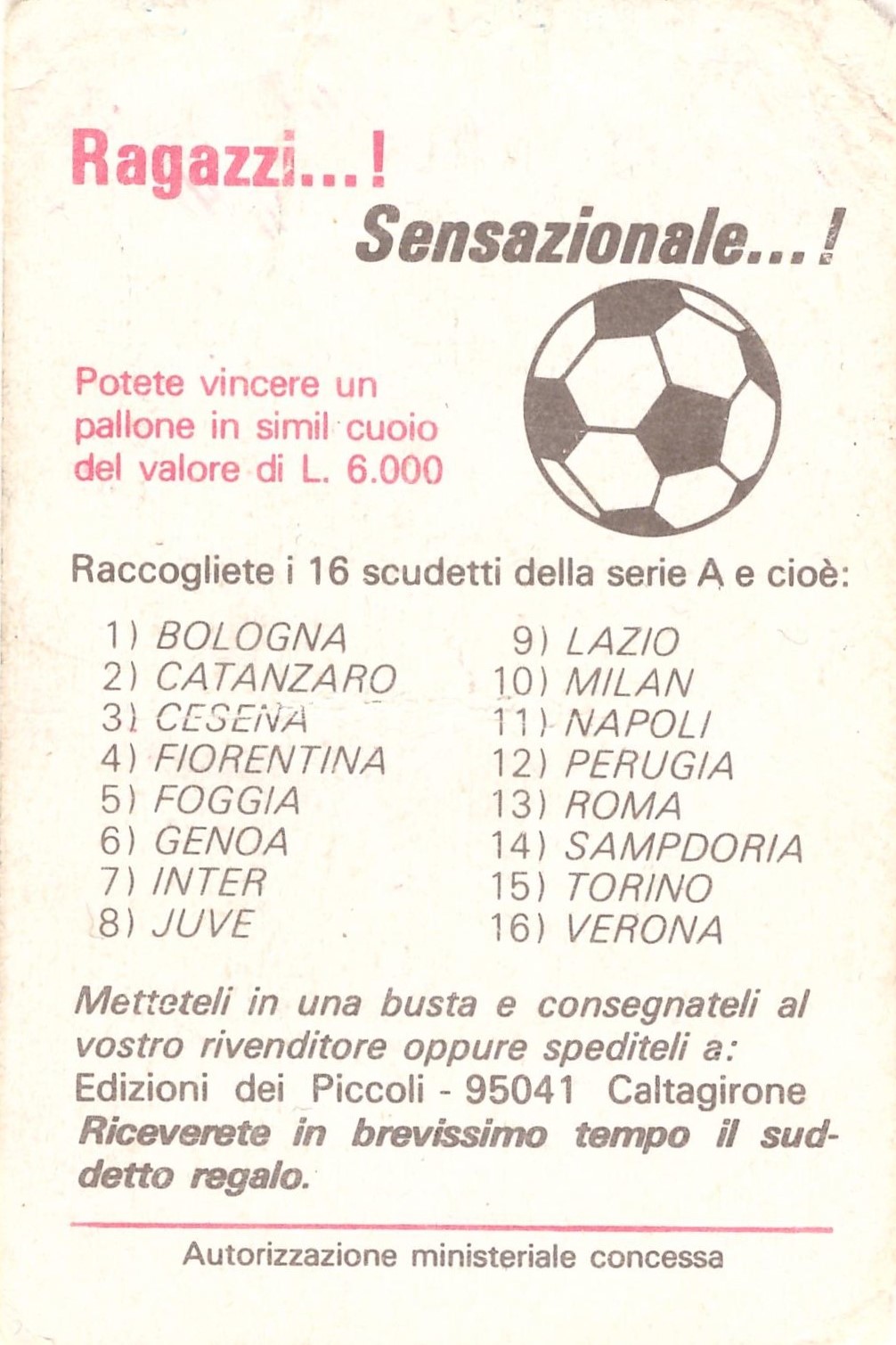 Edizioni dei Piccoli Calcio Scudetti 1976-77 retro autorizzazione