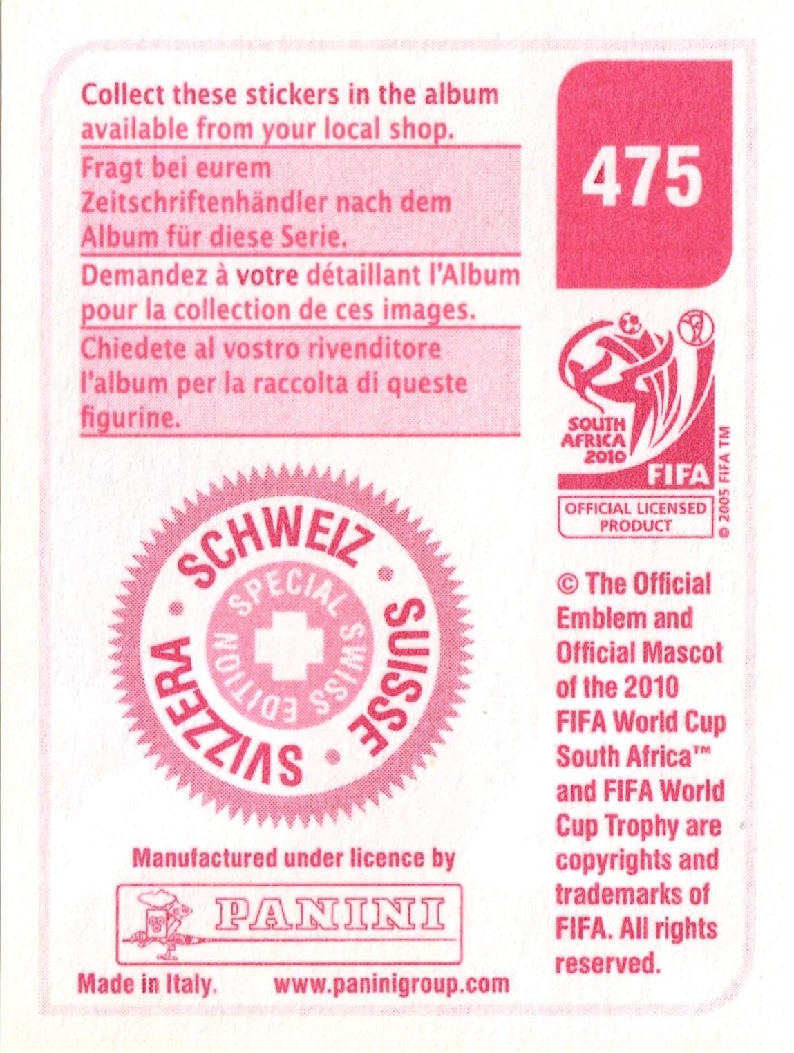 Panini World Cup South Africa 2010 2009-10 Versione Svizzera retro