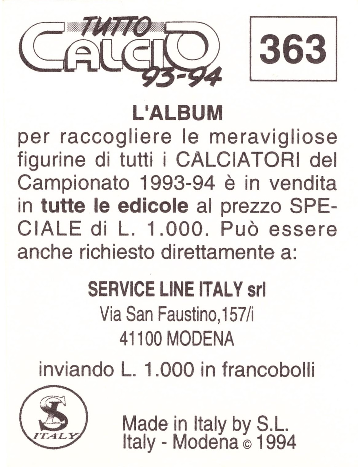Service Line Italy Tuttocalcio 1993-94 bustina retro