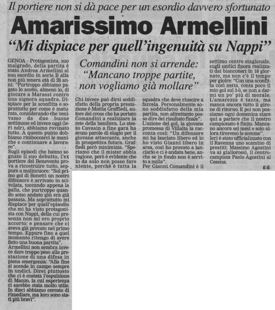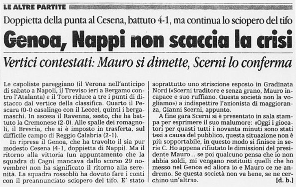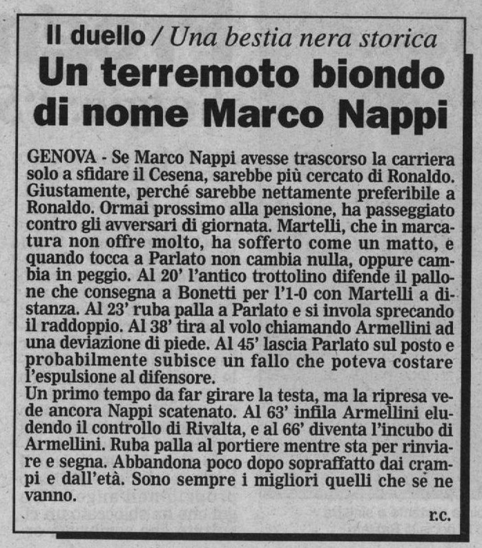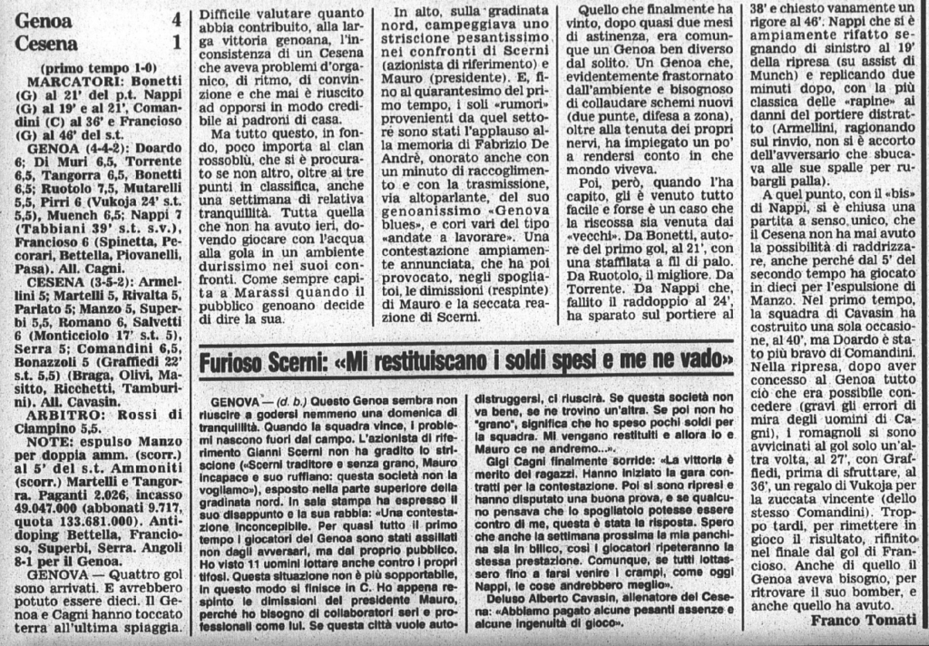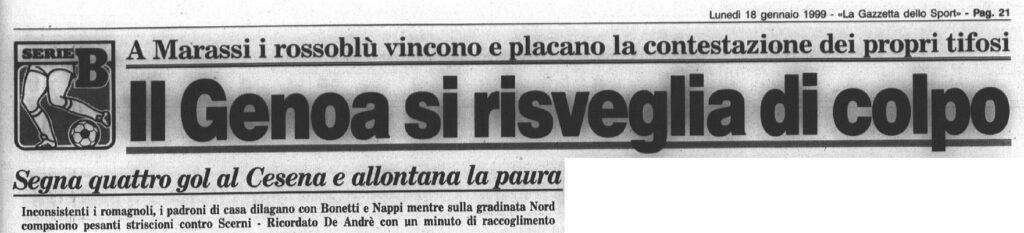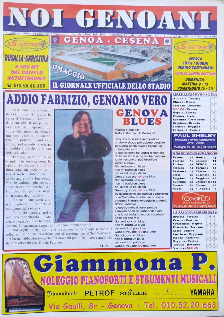 Il giornalino dello stadio di Genoa-Cesena ricorda la scomparsa di Fabrizio De André grande tifoso del Griffone