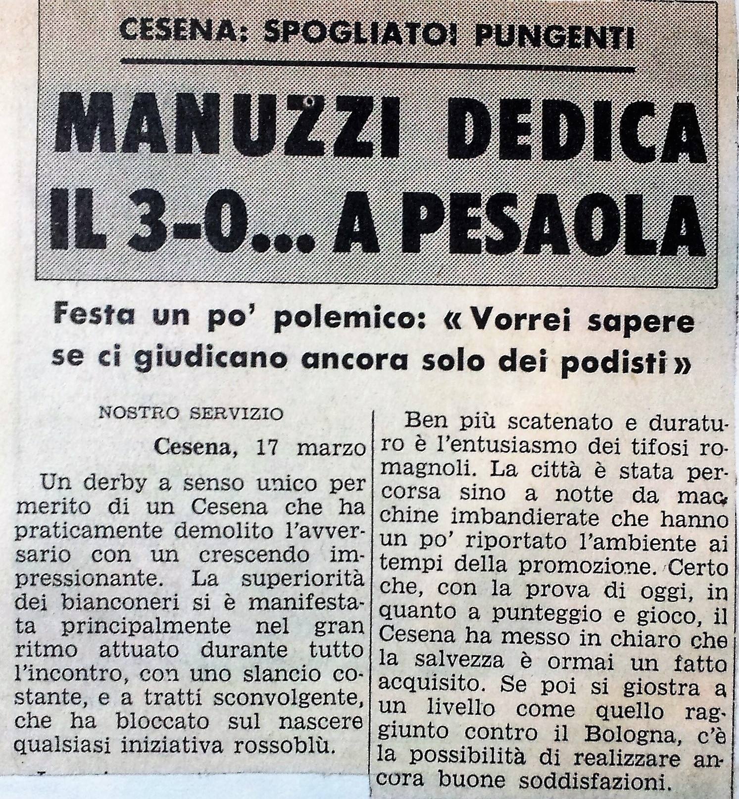 Del Bologna surclassato in campo si registrano dichiarazioni ai cronisti che contestano l’operato dell’arbitro Barbaresco per non aver fischiato un presunto fallo di Toschi su Roversi, azione che aveva portato alla prima rete dei romagnoli. Il dopo partita vede i tifosi felsinei tornare mestamente in stazione con le bandiere arrotolate, al contrario dei tifosi del Cesena che fanno cortei con auto strombazzanti fino a sera, ripetendo l’entusiasmo della promozione in serie A di giugno con il Mantova! Per me, il mio primo derby in campionato col Bologna, era terminato con un trionfo per me inaspettato.