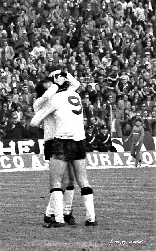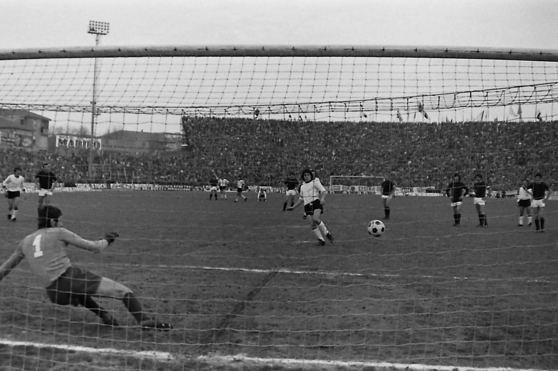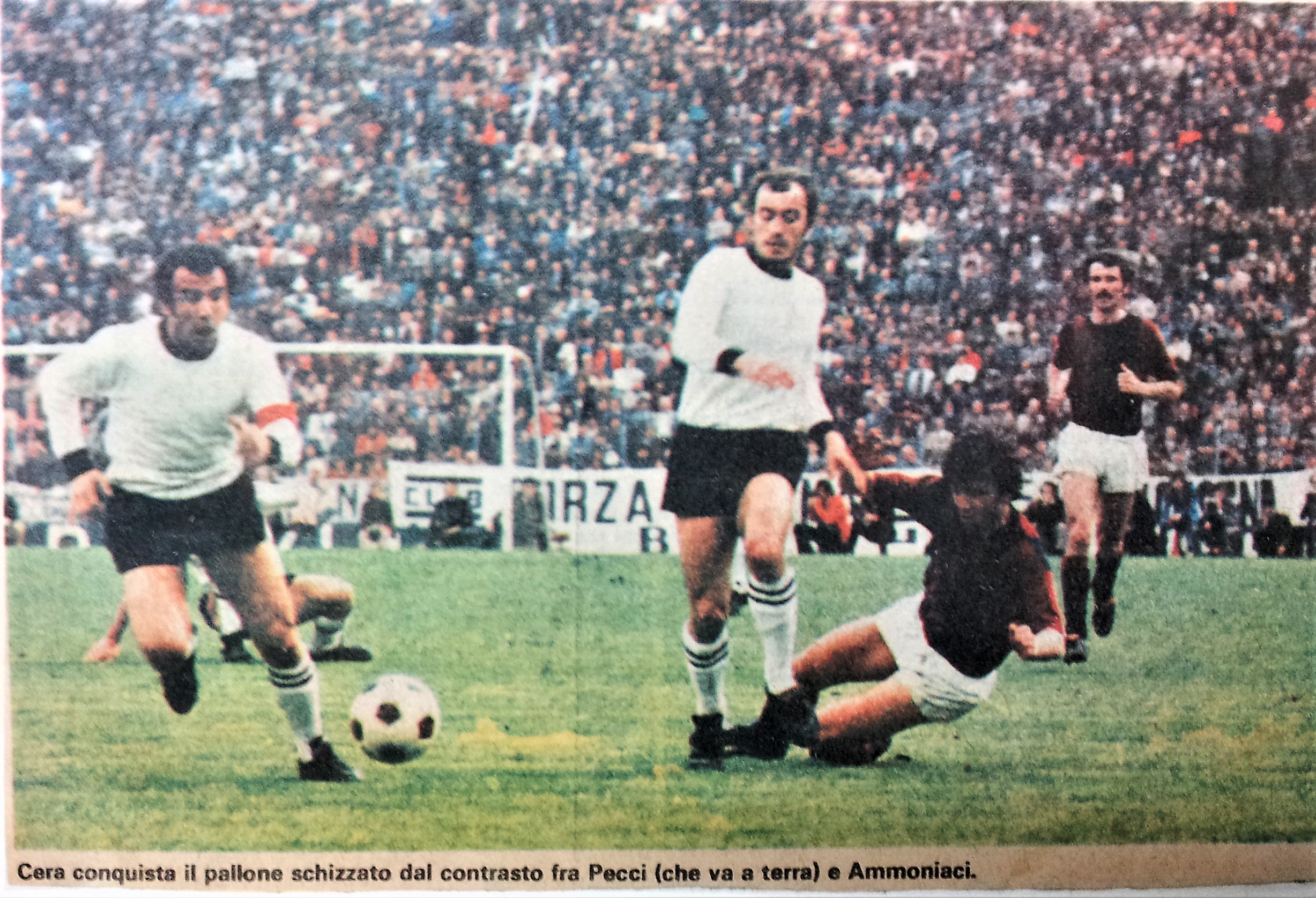 È il mio primo derby in campionato con il Bologna. Una partita sentitissima, sebbene l’allenatore felsineo Bruno Pesaola in settimana avesse gettato benzina sul fuoco, dicendo che i giocatori del Cesena erano soprattutto “podisti” e che i bianconeri erano destinati alla retrocessione in B. Parole incaute che lo faranno masticare così amaro, a tal punto da non presentarsi davanti ai cronisti nel post partita. Probabilmente Pesaola non sapeva dei trascorsi tra gli emiliani e i romagnoli, in particolare della batosta (5-0) subita al campo dell’ippodromo nel campionato di Guerra 1944, quello celebre vinto dai Vigili del Fuoco di La Spezia. Cesena da non sottovalutare quindi. È una bella giornata di sole, la temperatura è mite. Una domenica che da bella diventerà indimenticabile. Il fischio di inizio è alle ore 15 e io parto con buon anticipo da casa mia a Sant’Agostino. Lungo il tragitto che percorro a piedi, nella discesa di San Pietro, un signore distinto piuttosto grosso, ben vestito con un grande cappello, mi chiede indicazioni per lo stadio. Gli rispondo che basta che segua me o il flusso delle numerose persone perché tutti andiamo alla Fiorita. Senza che gli chiedessi niente comincia a dire che lui è venuto ad assistere alla certa vittoria del Bologna e, davanti alle mie risate, stizzito tira fuori un grosso portafogli dicendo che era pronto a giocarselo… La tipica boria di alcuni bolognesi, quelli che dicono che loro sono primi in tutto, soprattutto in cucina. Ne conosco qualcuno che ogni tanto me la mena sulle loro lasagne a sette strati superiori alle nostre, sulle nostre presunte fettuccine mentre le vere tagliatelle più larghe e più spesse sono le loro. Per non dire del ragù, il loro è il primo al mondo, oppure della loro superiorità sui bolliti che noi (secondo loro) conosciamo a malapena.
