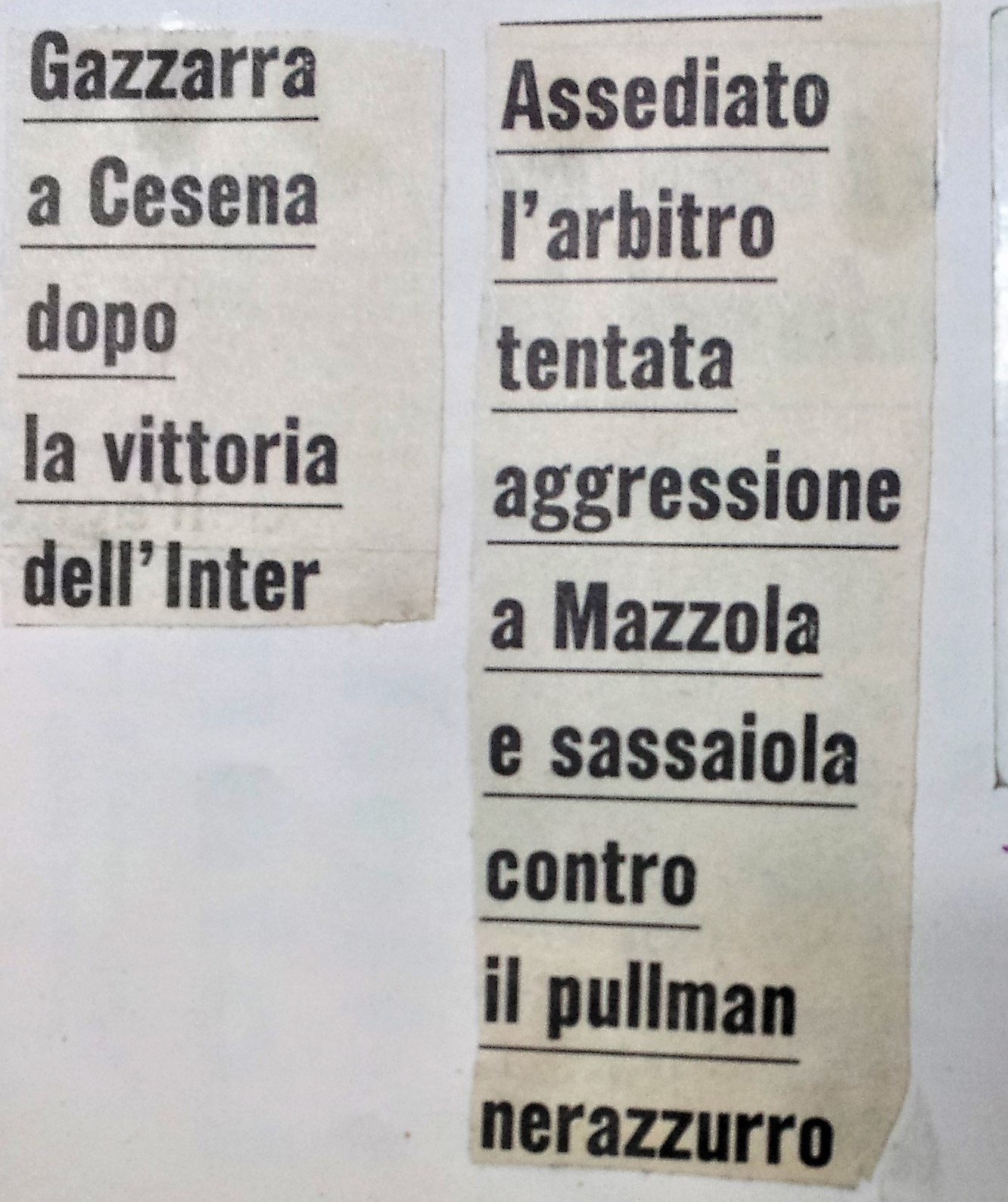 L’ASSEDIO ALL’ARBITRO. Uscendo dal Curvone andai a vedere davanti alla tribuna cosa succedeva. C’era un trambusto incredibile, la gente non aveva digerito l’arbitraggio e voleva “giustizia”. Ricordo Sigfrido Piccinini (delle future Brigate Bianconera) che stava sul tetto dell’allora casetta del custode (ora adibita a uffici) e con un bandierone arringava la folla. Il resto l’ho letto dai giornali. Circa 4.000 tifosi (fonte Stadio) cinsero d’assedio la Fiorita, alcuni addirittura riuscirono ad entrare negli spogliatoi e uno addirittura fu fermato mentre tentava di entrare nello stanzino dell’arbitro. Un gruppetto di supporter cesenati tentò di aggredire Mazzola intento a firmare autografi: “mafioso mafioso” gli gridavano. Solo il pronto intervento della polizia permise al giocatore di allontanarsi senza danni. Gente assiepata dietro i cancelli colpiva il pullman dei giocatori dell’Inter con sassi e bottigliette di vetro e solo un paio d’ore dopo il termine della partita riuscirà ad andarsene. Persino un’ambulanza venne fatta oggetto di lancio di pietre dai tifosi cesenati inferociti e addirittura perquisita pensando che all’interno si fosse nascosto l’arbitro Toselli che stavano cercando ovunque. L’assedio ebbe anche risvolti comici quando il presidente dell’Inter Ivanoe Fraizzoli fu zittito dalle mogli dei giocatori bianconeri. Dopo alcune ore la polizia riuscì a portare in salvo la terna arbitrale fortunatamente incolume, caricandoli su di una “Gazzella” come fossero dei banditi… (Bisogna però aggiungere che la partita fu corretta, come fu corretto il comportamento dei giocatori nerazzurri).