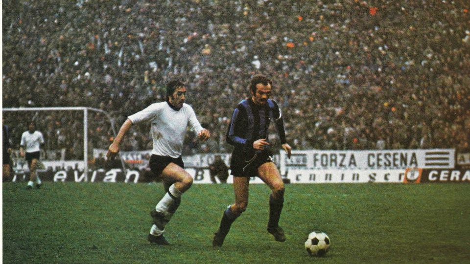 LA PARTITA. L’Inter non combinò granché dalla cintola in su, ma due occasioni importanti, entrambe di Mazzola, la seconda della quale era il gol della vittoria con il “Baffo” che si era trovato a tu per tu con Boranga. Il Cesena fece la partita dal primo all’ultimo minuto, andò 5-6 volte al tiro pericolosamente, chiese invano tre rigori e almeno in due casi l’impressione generale fu che si potevano concedere… Ma la partita ruotò tutta attorno ad un episodio all’11’ del primo tempo: Braida affronta Facchetti in un contrasto frontale e conquista palla, fugge sulla destra e crossa per Festa appostato appena fuori area, il quale si aggiusta il pallone e fa partire un gran tiro che fulmina Bordon proprio all’incrocio dei pali. Questa è la versione del celebre radiocronista Piero Pasini di Bologna su “Tutto il calcio minuto per minuto” (che si può ascoltare dal link in questa pagina) il quale calcò la mano sul fatto che nessuno capì il perché dell’annullamento. Invece per la Gazzetta la rete fu annullata per un fallo su Burgnich. Ma era una versione perlomeno fantasiosa poiché il libero dell’Inter (come si vede nella prima foto) era distante circa tre metri dal nostro Festa. Secondo me non c’era stato nessun contrasto e, infatti, nessun interista aveva protestato. Fu un abbaglio dell’arbitro Toselli della sezione di Cormons.