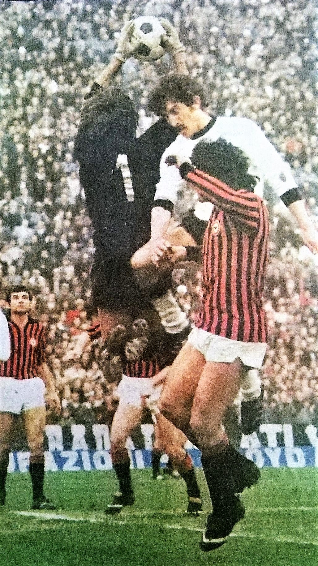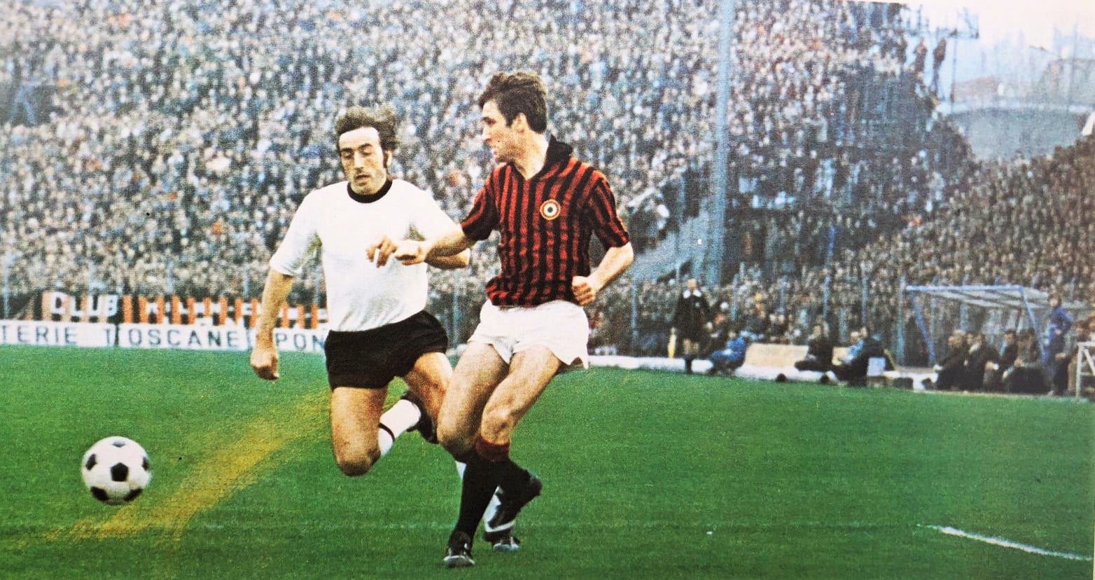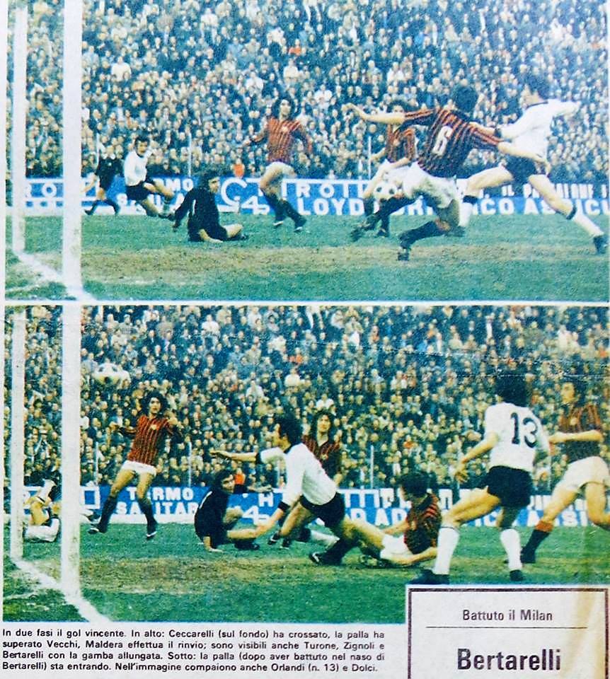 Tra le più importanti partite della storia del Cavalluccio metto Cesena-Milan del 10 febbraio 1974, per almeno due motivi: 1) è la prima volta che in campionato vinciamo contro una squadra di primissimo piano (finalmente lo “scalpo” di una strisciata); 2) è la gara con più spettatori giocata a Cesena di tutti i tempi: 29.828 paganti più 6.210 abbonati, ma con gli aventi diritto, forze dell’ordine soprattutto, bambini che a quei tempi se accompagnati non pagavano e portoghesi in tutte le salse… non è azzardato pensare che quel giorno allo stadio fossimo in 40 mila.