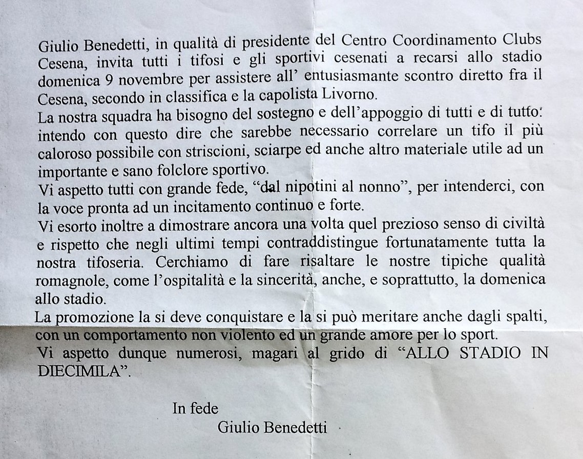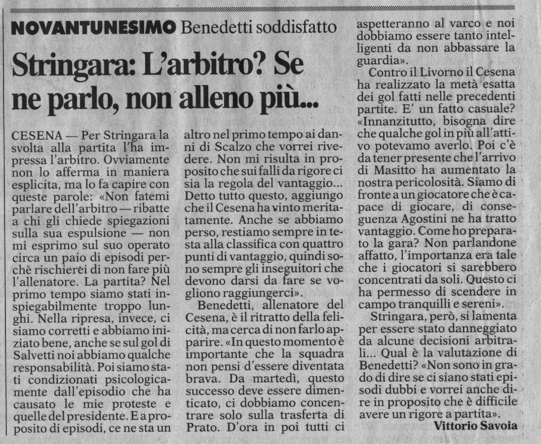 “A un dato momento” (cit.) uscì Stringara dalla sala stampa, nero come il carbone e visibilmente infastidito per quella che non era stata una sconfitta ma un tracollo. Passò davanti al nostro terzetto di amici e all’improvviso, senza una motivazione, mi agitò davanti agli occhi quattro dita dicendo che erano ancora quattro i punti di vantaggio… Daniele pur stupito non aprì bocca, Bulgan mi fece: “Ma gli hai detto qualcosa?”. Io: “Ma no, lo guardavo solo”, poi dopo un attimo di silenzio feci la cazzata. Andai ai piedi del pullman, dove c’era Stringara che discuteva animatamente con l’autista, e a voce alta gli dissi: “Stringara! I conti li facciamo a fine campionato”. L’allenatore toscano e soprattutto l’autista chiamarono immediatamente la polizia che sgomberò il piazzale per le spicce. Io mortificato rimasi nascosto dietro ad una colonna con Parlato e Rivalta. L’avevo combinata grossa, non dovevo assolutamente permettermi un tale comportamento, considerato che indossavo la tuta del Cesena e il cartellino di riconoscimento. Infatti l’autista e Stringara avevano sostenuto che un tesserato bianconero li aveva infastiditi. Fatto partire in fretta e furia il pullman del Livorno, anche io me ne andai a casa rimuginando. Mi aspettavo di essere cacciato dal servizio allo stadio o come minimo una forte lavata di capo. Invece nessuno mi disse niente e la passai incredibilmente liscia. Gli amici del Centro Coordinamento, però, da quella volta mi chiamarono “Stringara”.