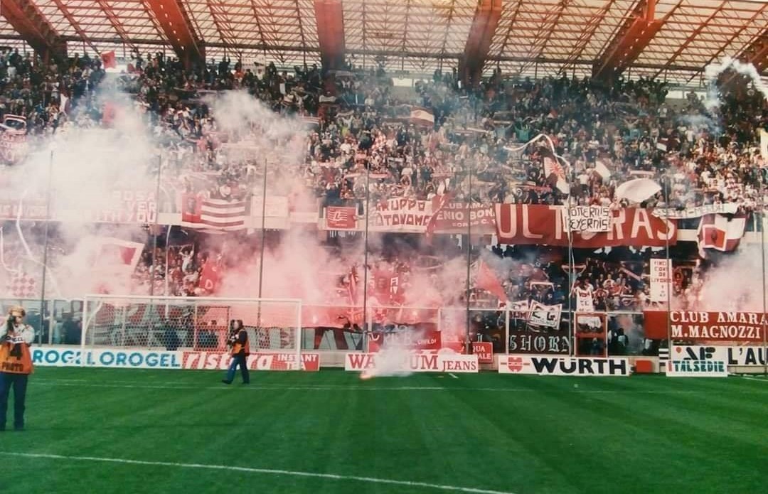 Ho fatto undici campionati di servizi vari allo stadio con il Centro Coordinamento a partire dal 1995 e la stagione 1997-98 è tra quelle che ricordo più volentieri anche se eravamo in serie C. Il 9 novembre 1997 non era una partita come le altre, arrivava l’indiscussa capolista Livorno, reduce da 9 vittorie iniziali consecutive, allenata dal bravo Paolo Stringara. Proprio lui, quell’ex bolognese che con un suo gol ci precluse la B diretta nel 1986-87 e ci condannò ad una lunga serie di spareggi, finiti per fortuna in trionfo. Quel giorno noi del servizio eravamo un po’ in confusione e invece di controllare come al solito l’accesso alle scale della gradinata lato Curva Mare, a me dissero di spostarmi dalla parte opposta, lato curva Ferrovia. Dovevamo aprire un varco per far entrare i livornesi in gradinata, considerato che il loro settore era pieno già due ore prima della gara e altri tifosi amaranto continuavano ad arrivare allo stadio. In totale credo non fossero meno di 8 mila, con decine di bandiere con la falce e il martello, tante altre con l’effigie del Che. Mai vista una tifoseria più schierata politicamente. Quelli fatti spostare in gradinata laterale erano tutt’altro che tranquilli. Un energumeno litigò con un mio collega e gli rifilò un sonoro ceffone. Se lo tenne senza replicare…
