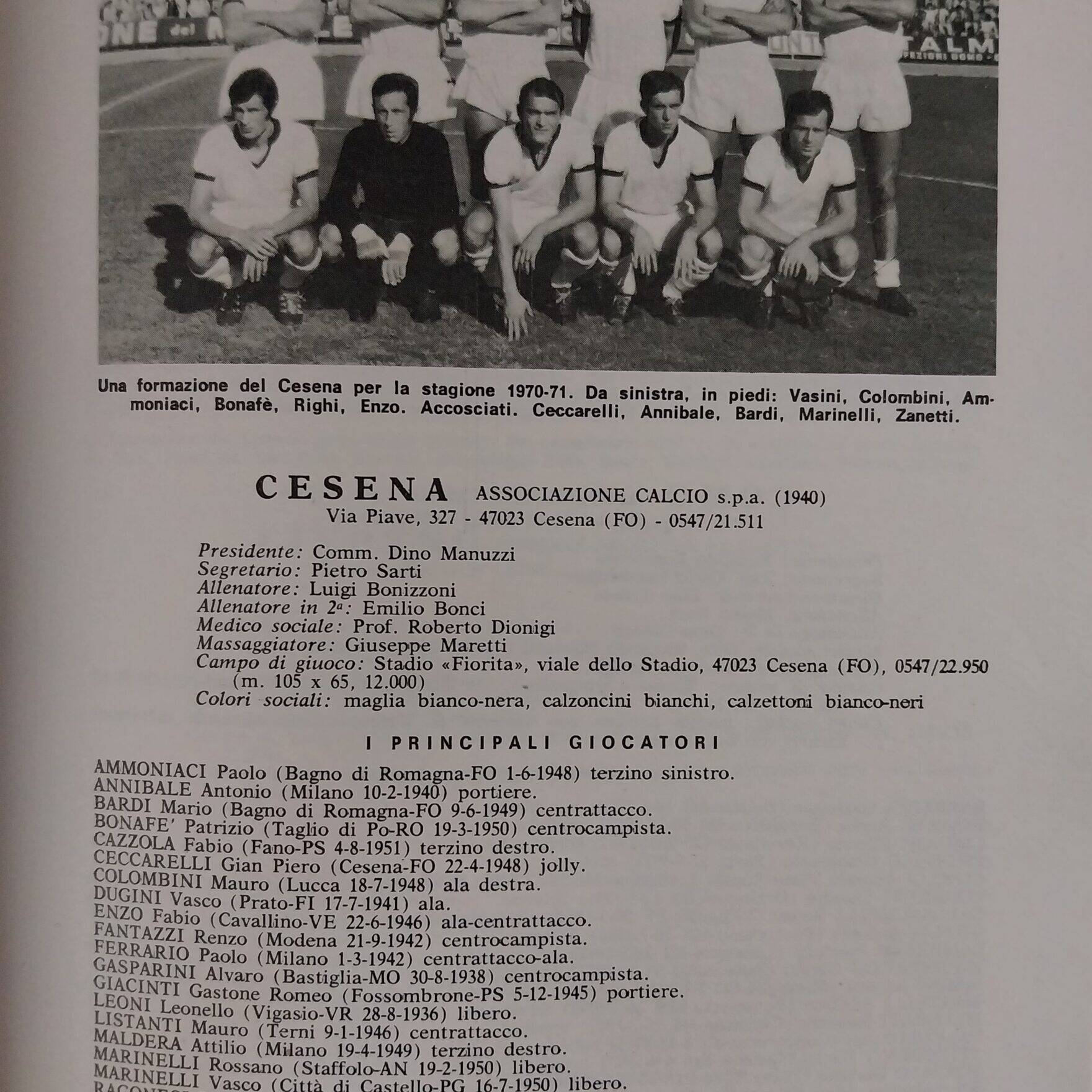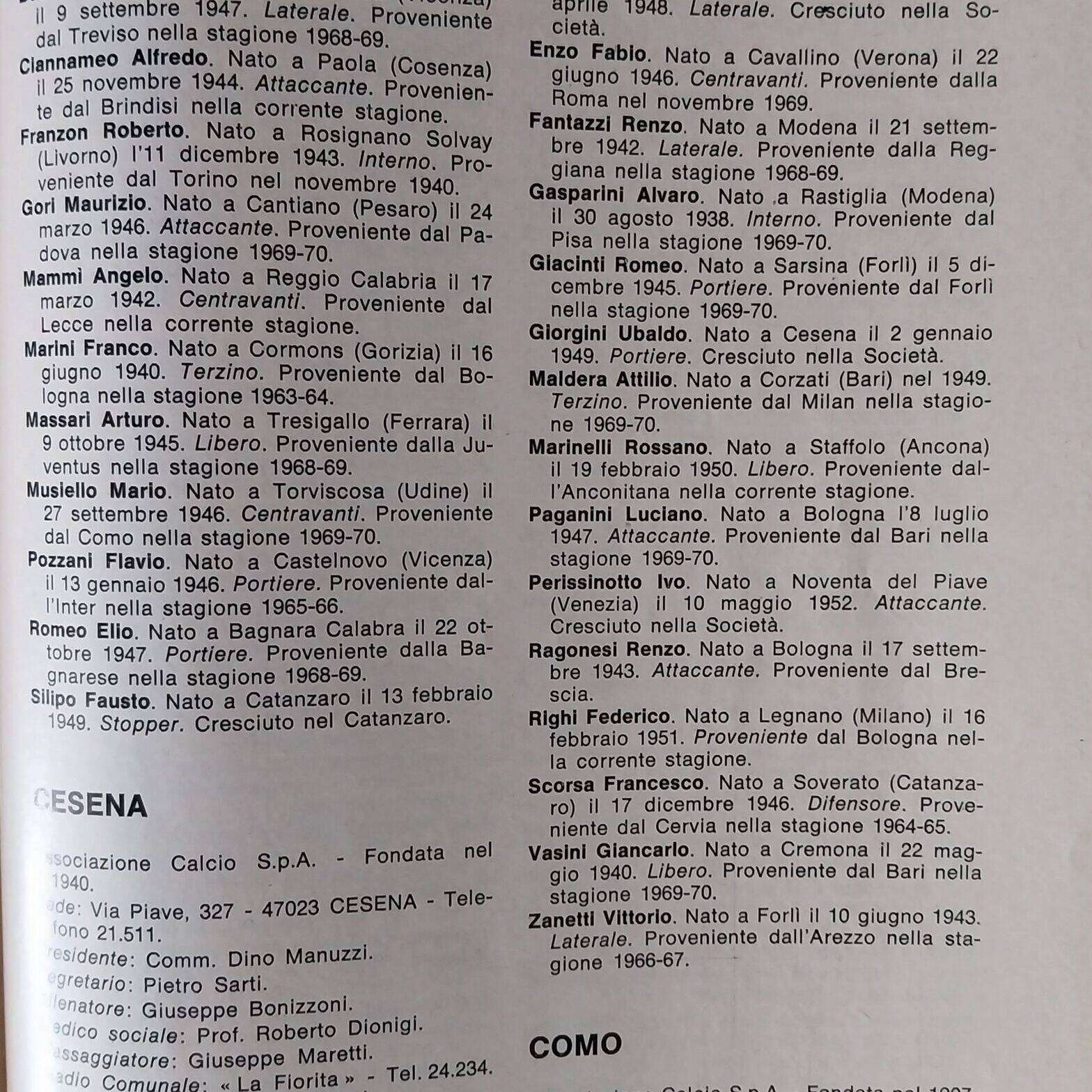 Tutto sulle squadre di calcio ABC, Gino Sansoni Editore, 1970, p. 78, presentazione Cesena 1970-71 Manuzzi Dino Ferrario