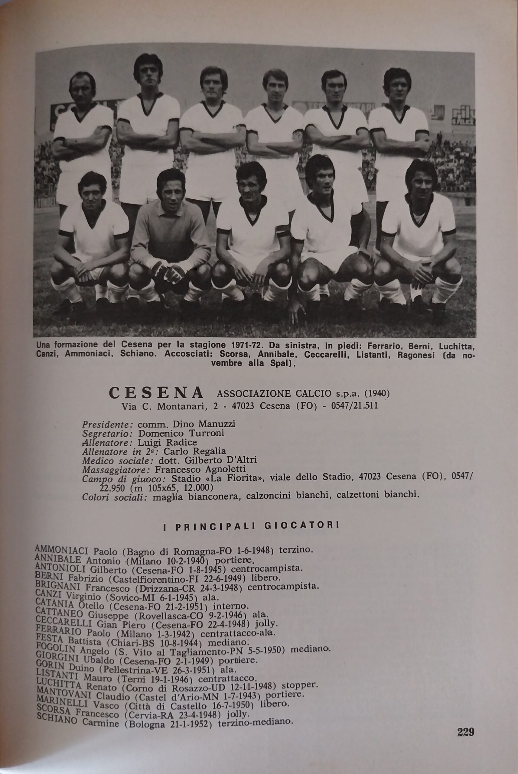 Almanacco del Calcio Panini 1972, p. 229, presentazione Cesena 1971-72