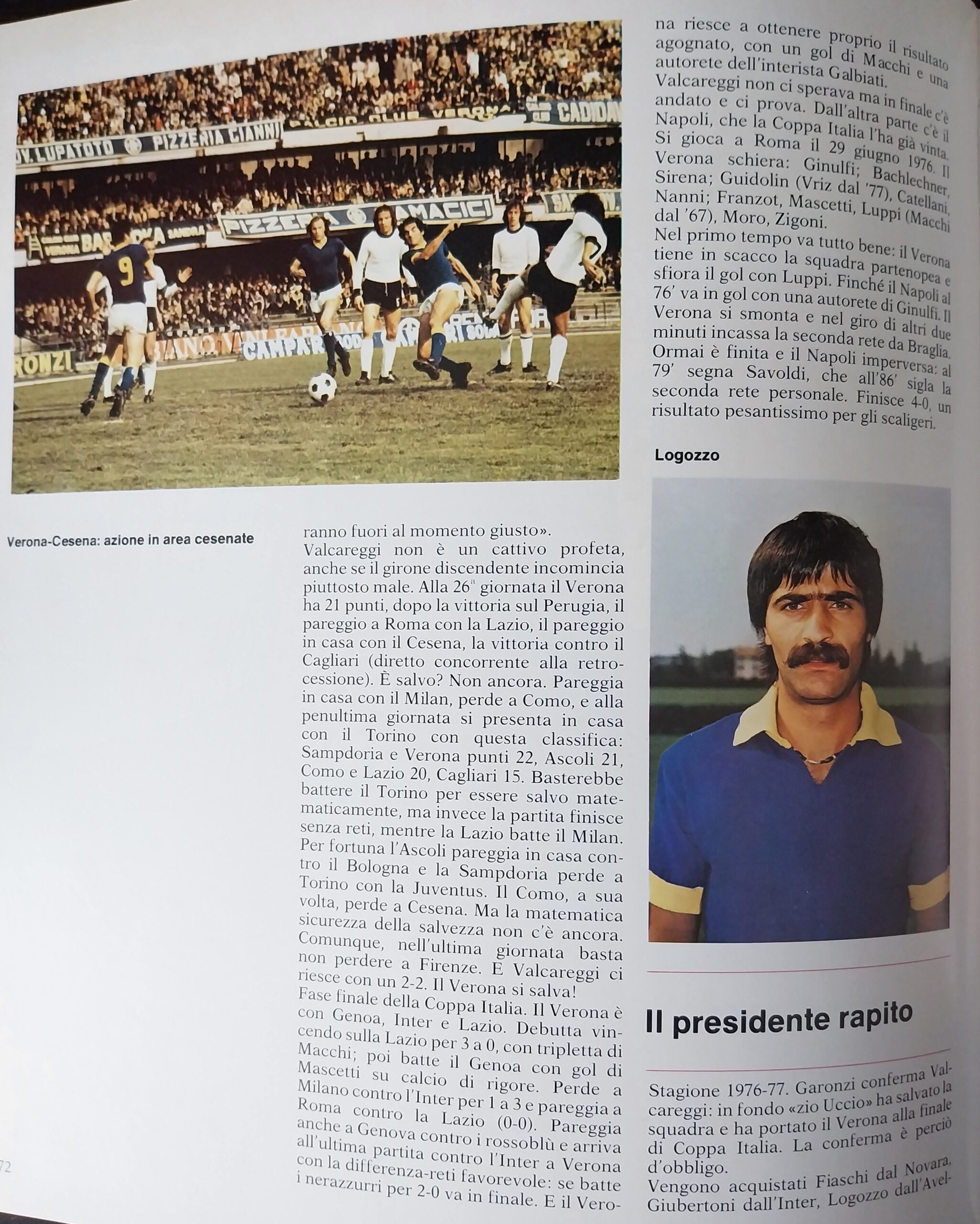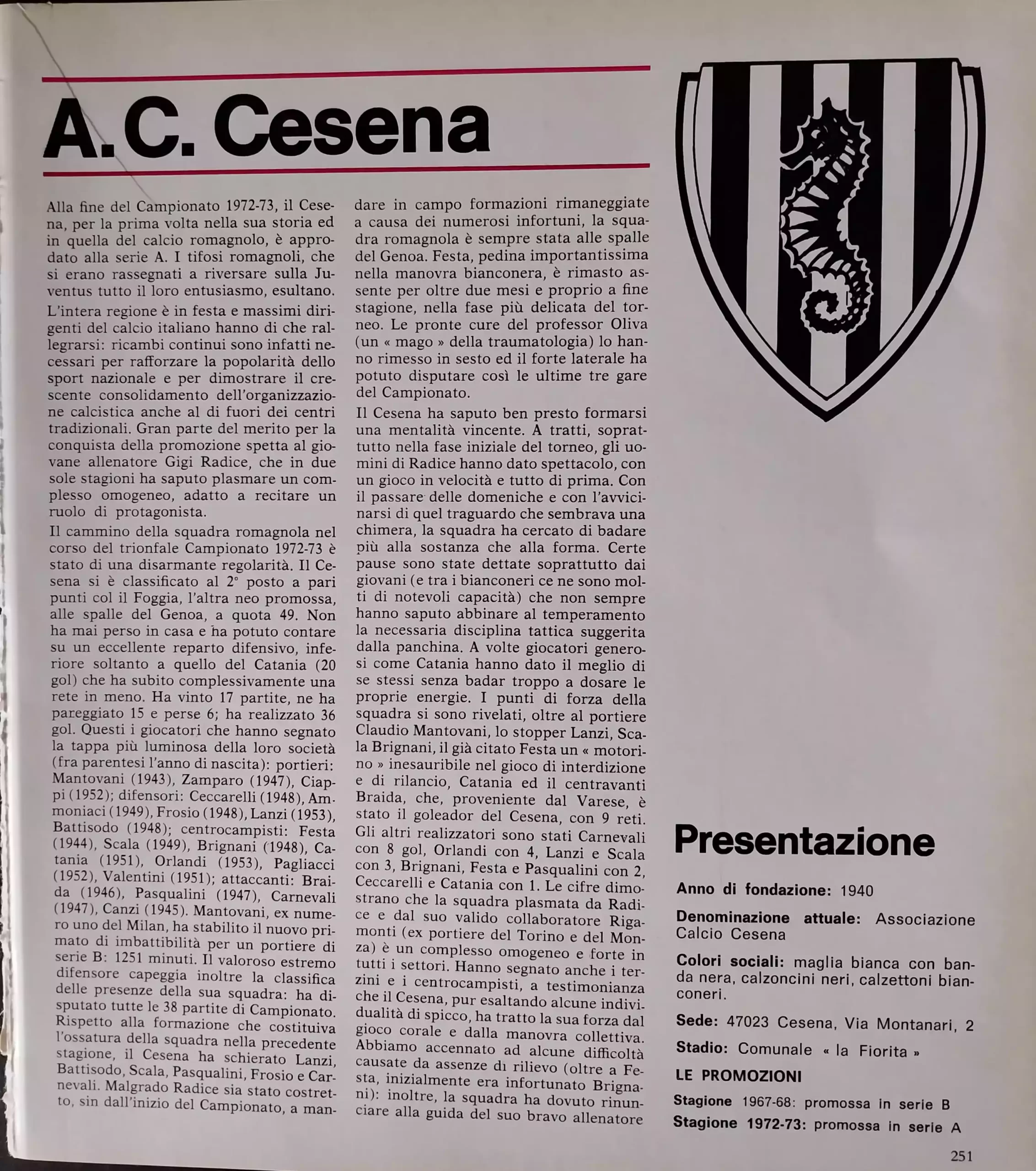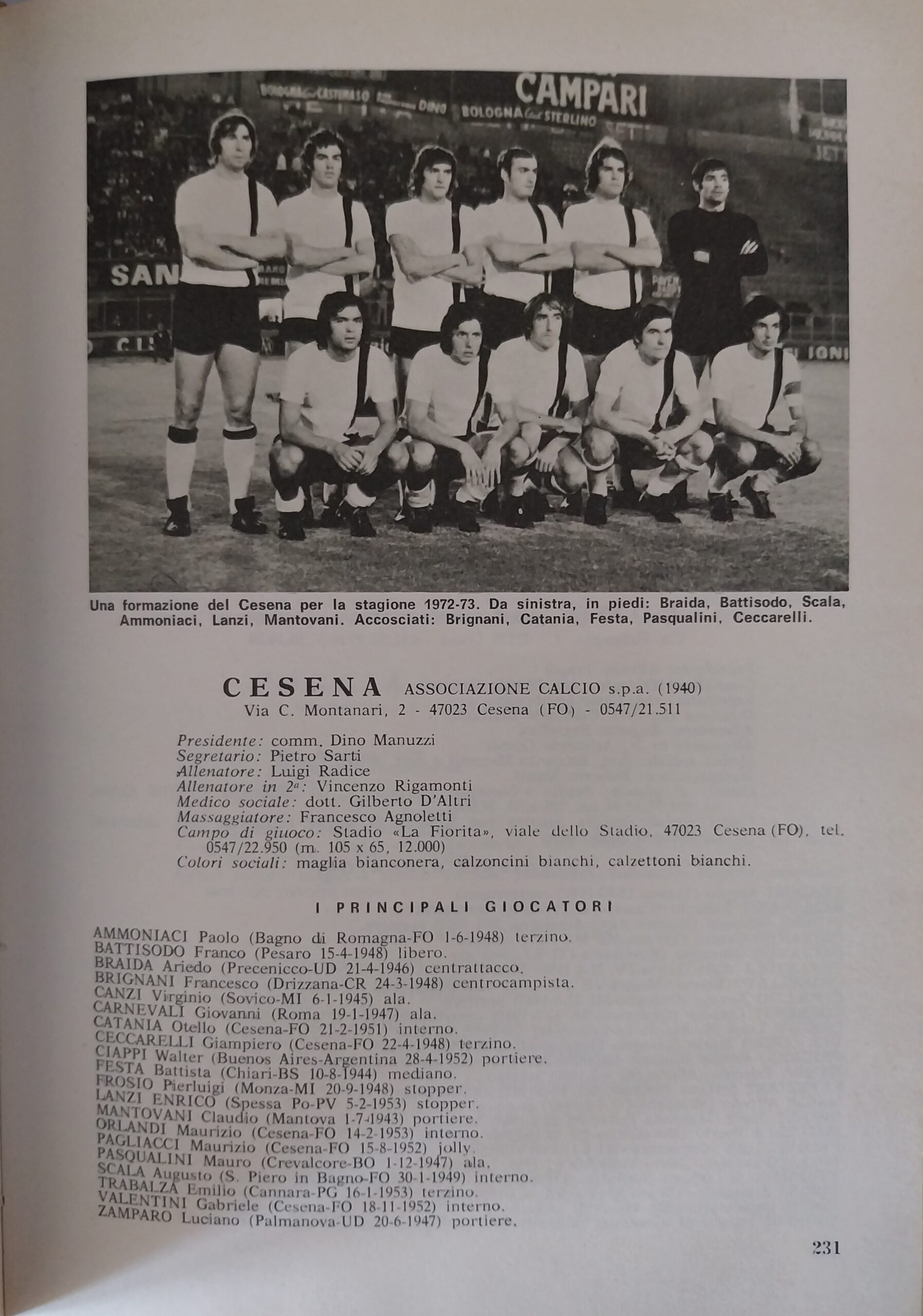 Almanacco del Calcio Panini 1973, p. 231, presentazione Cesena 1972-73