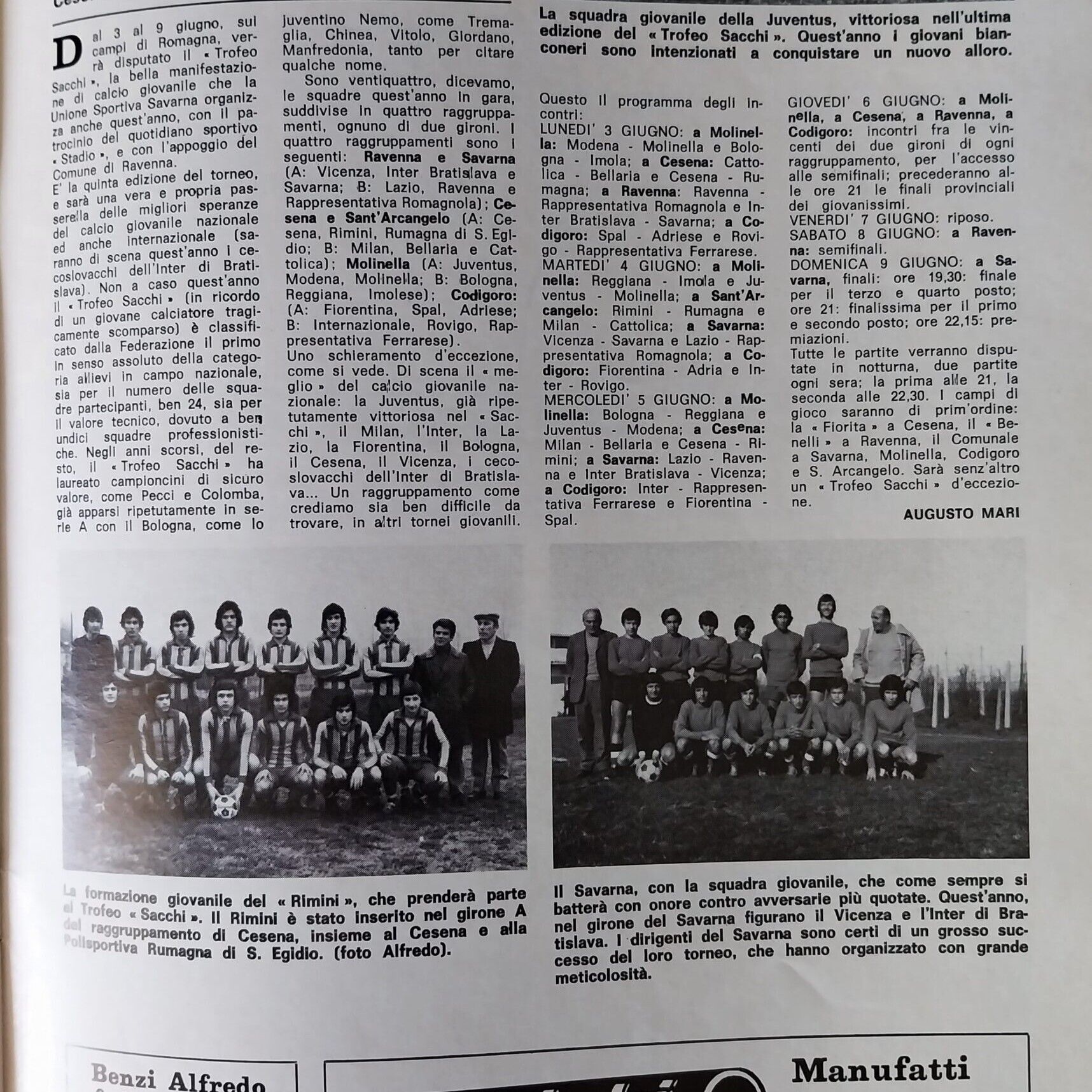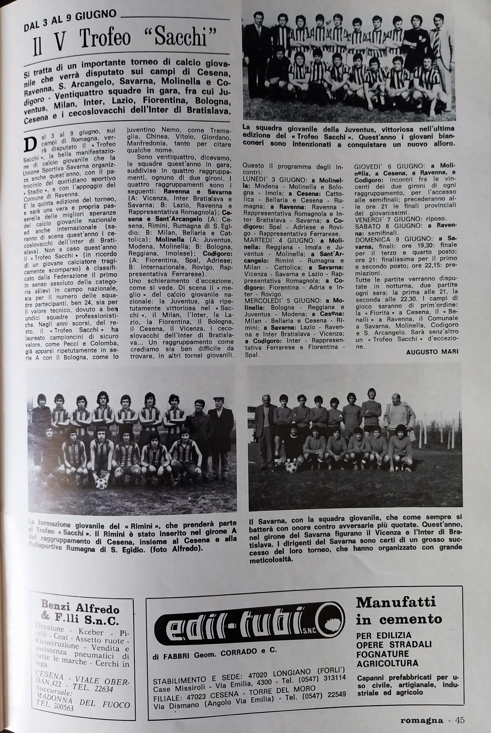 Romagna giugno 1974, n. 6, p. 45, articolo Trofeo Sacchi Allievi Cesena 1973-74