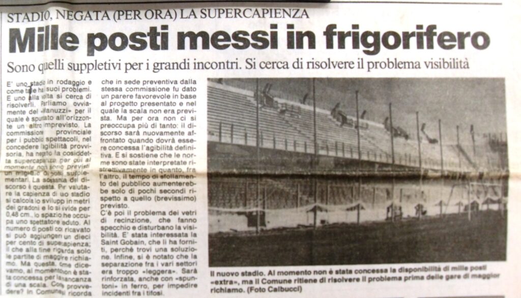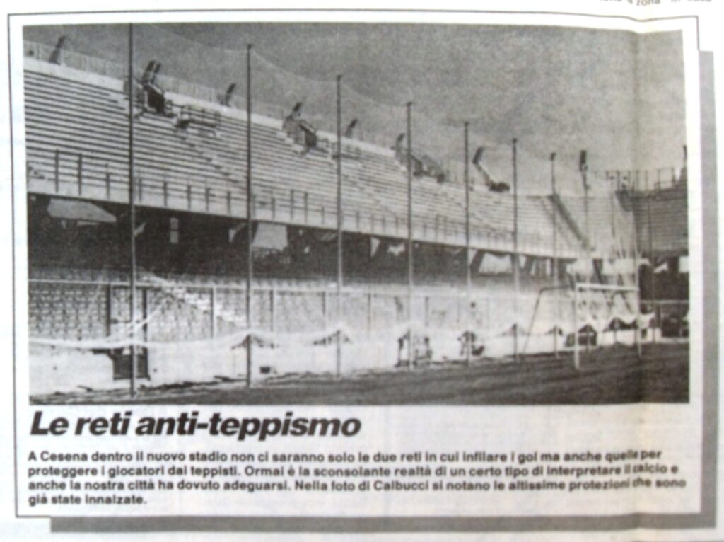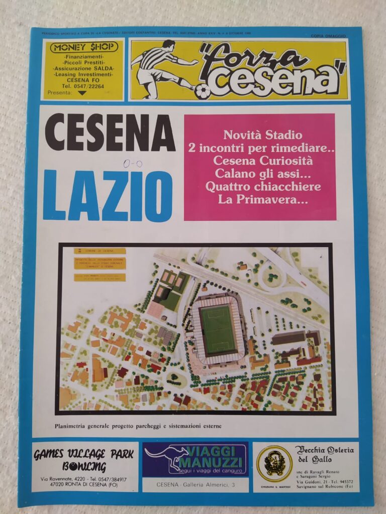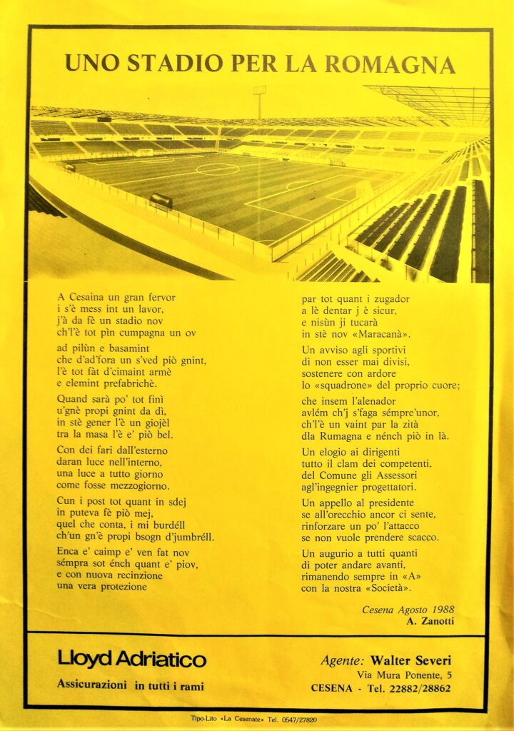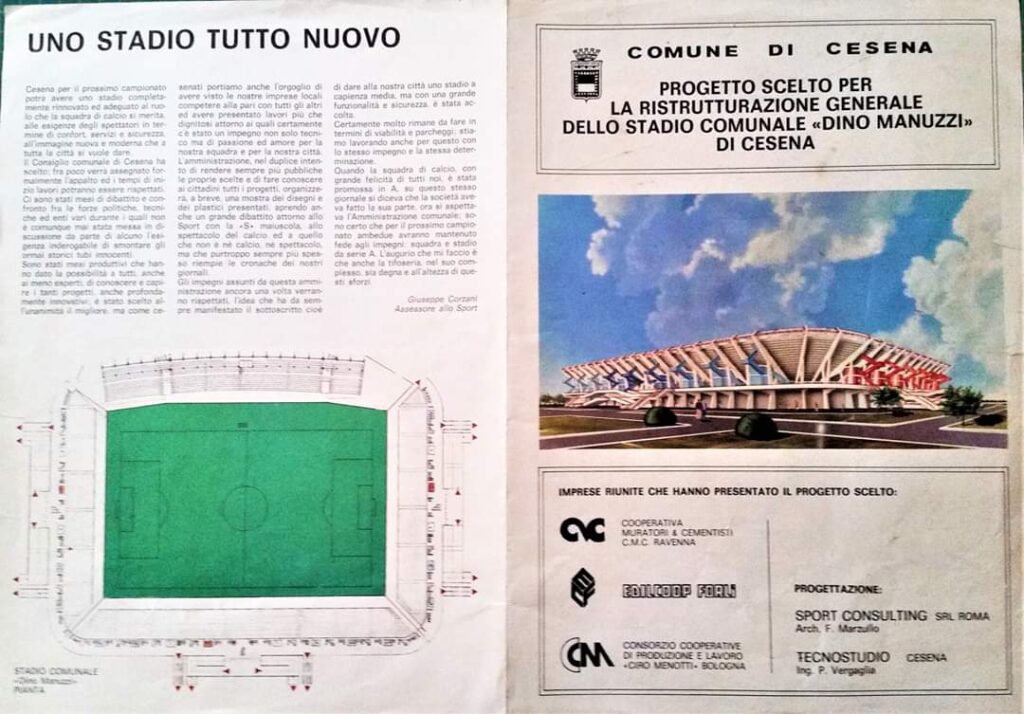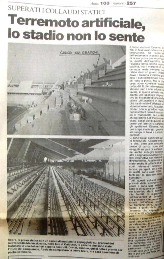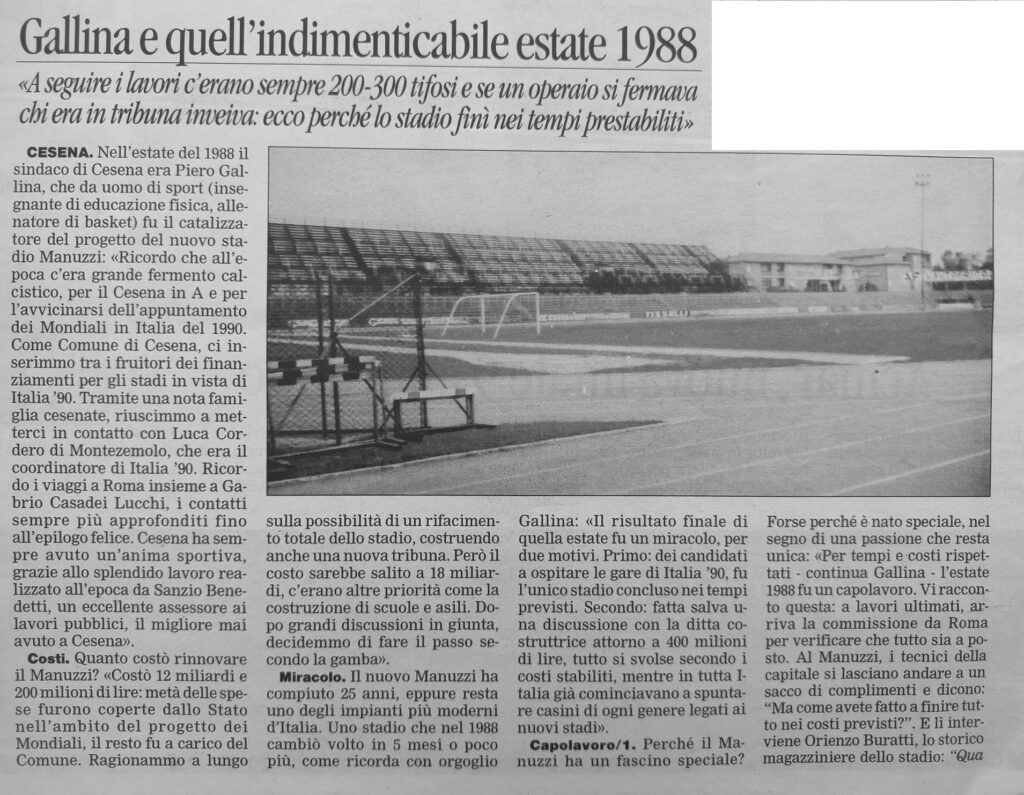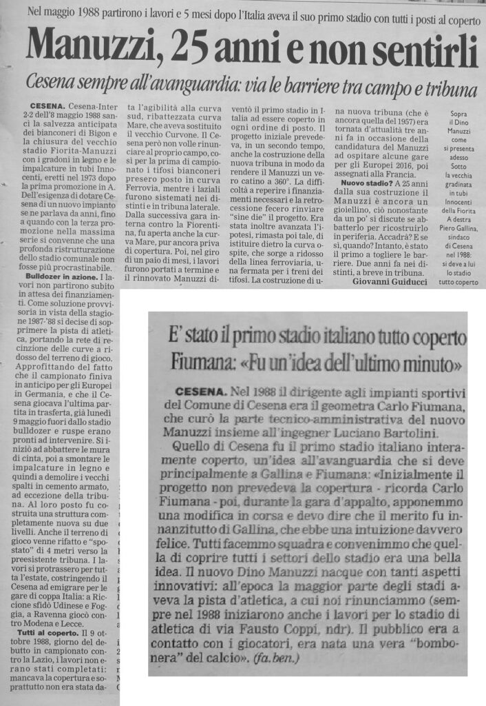 La Curva Mare sta nascendo (foto Zammarchi) Si apre il cantiere al Manuzzi (foto Zammarchi) Sullo sfondo la curva Ferrovia in costruzione (foto Zammarchi) La gradinata è stata abbattuta (foto Zammarchi) Una delle ultime immagini del Curvome (foto Zammarchi) La Curva Sud non c'è più (foto Zammarchi) Il curvino in demolizione Il Manuzzi è un cantiere (foto Zammarchi) I lavori procedono sotto gli occhi vigili degli "umarell" tifosi (foto Zammarchi) La nuova Curva Mare sta prendendo forma (foto Zammarchi) La curva per gli ospiti ancora in costruzione (foto Zammarchi) I pilastri della Curva Mare (foto Zammarchi) Al posto della vecchia gradinata sta sorgendo il nuovo settore dei distinti (foto Zammarchi) Si lavora tutta l'estate per costruire il nuovo stadio (foto Zammarchi) Si sostituiscono anche i fari per l'illuminazione Si gettano le basi per la nuova curva Ferrovia (foto Zammarchi) Il 9 ottobre 1988 riapre il nuovo Dino Manuzzi per Cesena-Lazio valida per la prima giornata di serie A Anche Gianmarten dedica al nuovo stadio una delle sue zirundele (1988) (da Il Resto del Carlino) (da Il Resto del Carlino) (da Il Resto del Carlino) Il ricordo del sindaci di allora Piero Gallina sul Corriere Romagna da Corriere Romagna Indietro