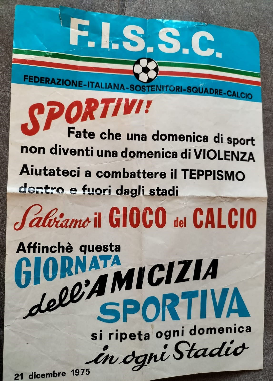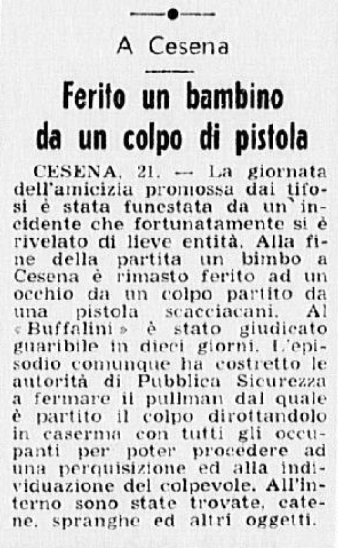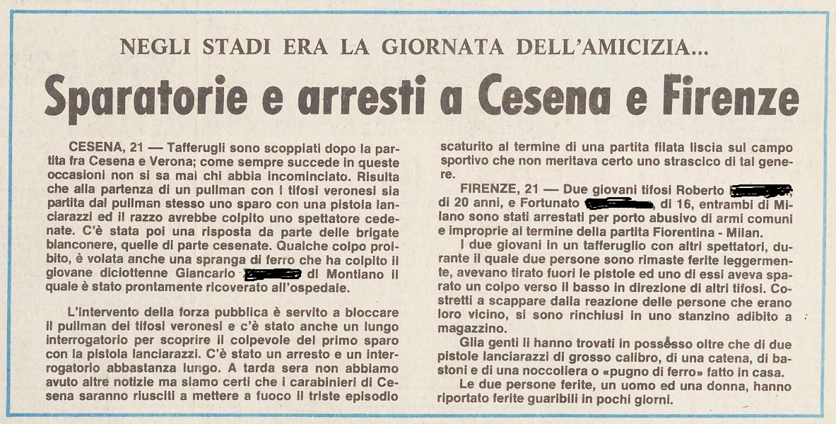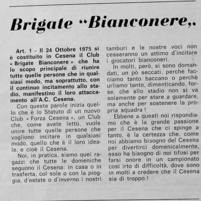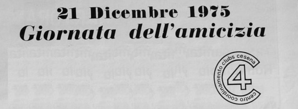 Il 21 dicembre 1975 era la “Giornata dell’Amicizia” tra i tifosi, organizzata in tutti gli stadi d’Italia dalla FISSC (Federazione Italiana Sostenitori Squadre Calcio) alla quale era associato anche il Centro Coordinamento Clubs Cesena. Quel giorno si giocava a Cesena-Verona di serie A e nel prepartita ci fu il giro di campo con i bandieroni dei rappresentanti delle due tifoserie, ma non delle Brigate Bianconere che pure quell’anno erano entrate nel Coordinamento.